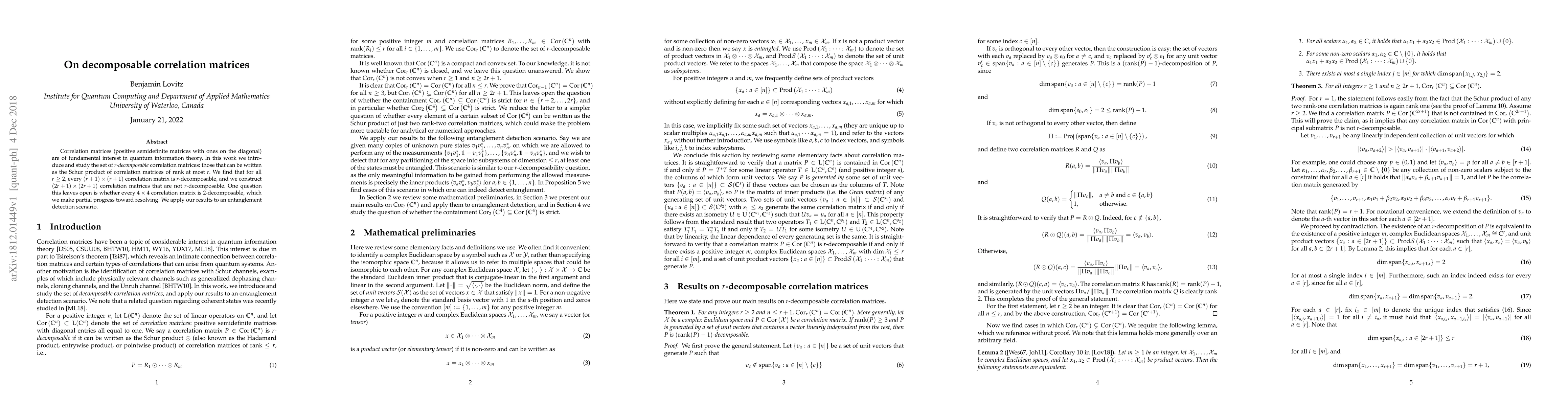 Correlation matrices (positive semidefinite matrices with ones on the diagonal) are of fundamental interest in quantum information theory. In this work we introduce and study the set of $r$-decomposable correlation matrices: those that can be written as the Schur product of correlation matrices of rank at most $r$. We find that for all $r \geq 2$, every $(r+1) \times (r+1)$ correlation matrix is $r$-decomposable, and we construct ${(2r+1) \times (2r+1)}$ correlation matrices that are not $r$-decomposable. One question this leaves open is whether every $4 \times 4$ correlation matrix is $2$-decomposable, which we make partial progress toward resolving. We apply our results to an entanglement detection scenario.