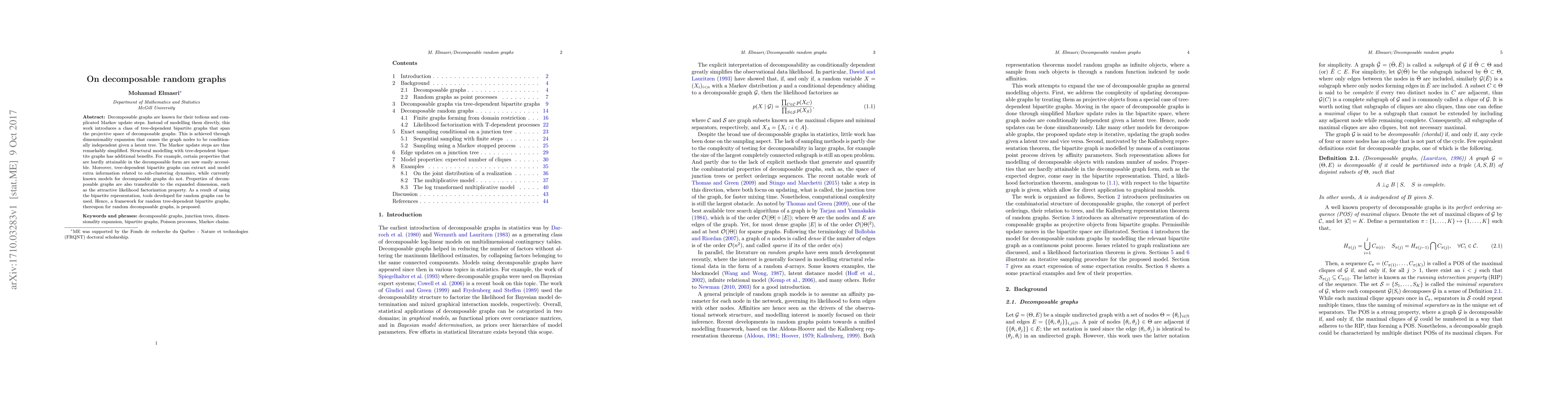 This paper proposes a framework for modeling decomposable graphs using tree-dependent bipartite graphs, which simplifies Markov update steps and allows for easier extraction of sub-clustering dynamics compared to traditional decomposable graph models. The approach leverages dimensionality expansion and latent tree structures to maintain properties of decomposable graphs while utilizing tools developed for random graphs.