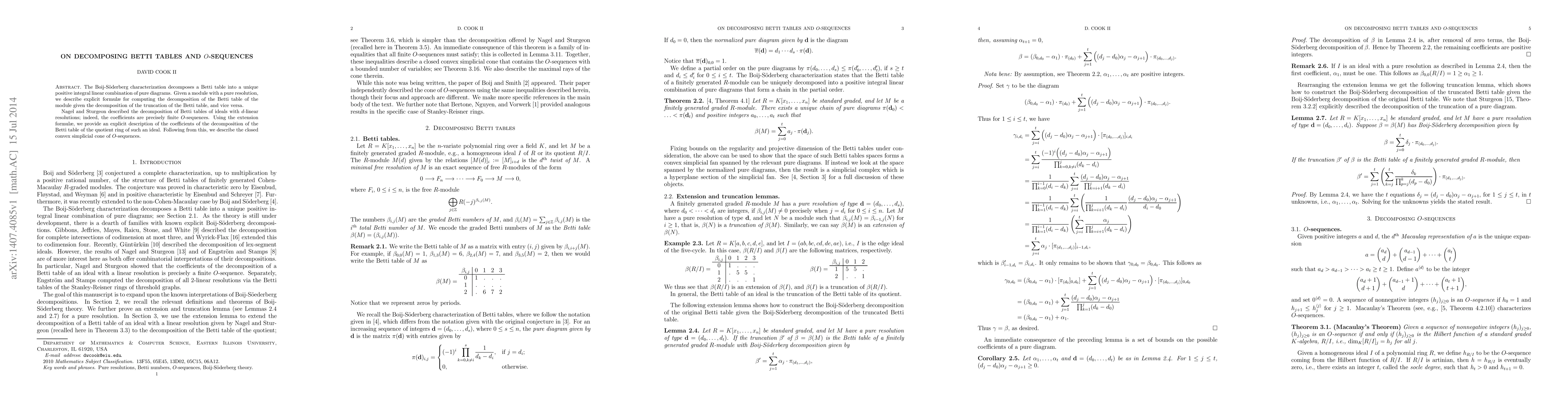 This paper decomposes Betti tables into pure diagrams using the Boij-Söderberg theorem, providing explicit methods for computing these decompositions from truncated tables and vice versa. It also extends the decomposition to ideals with $d$-linear resolutions, describing the coefficients as finite $O$-sequences and characterizing the closed convex simplicial cone of these sequences.