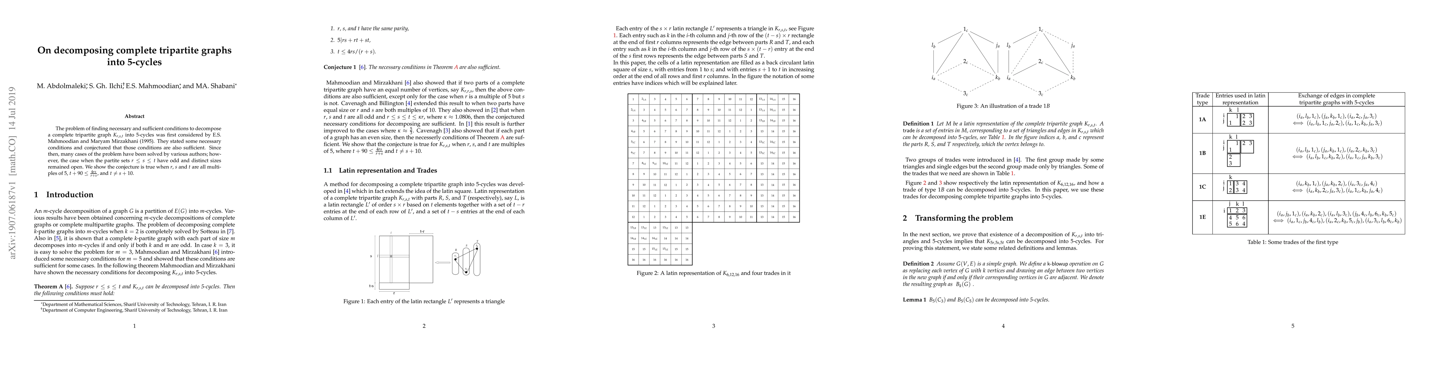 The paper presents a method to decompose complete tripartite graphs $K_{r,s,t}$ into 5-cycles, focusing on the case where $r \leq s \leq t$ are odd and distinct. It uses a Latin representation approach, covering parts B, C, and D with partial trades before expanding them into trades.