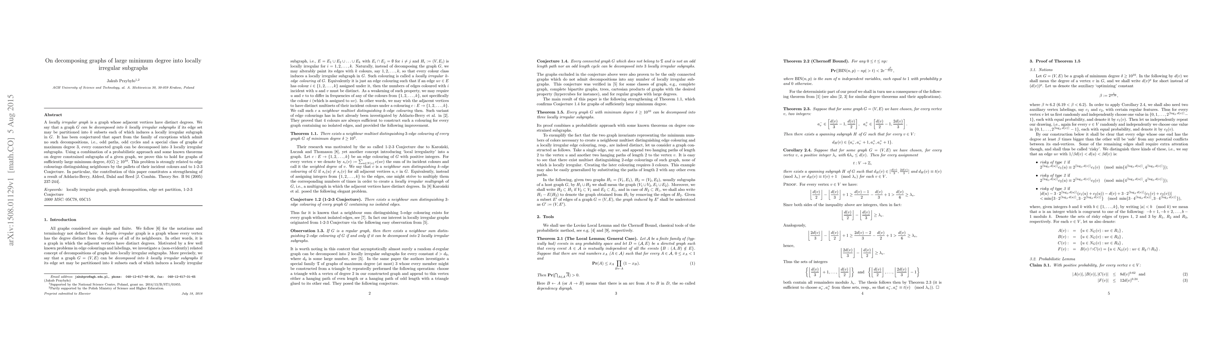 This paper proves that graphs with sufficiently large minimum degree (specifically $\delta(G)\geq 10^{10}$) can be decomposed into three locally irregular subgraphs, supporting a conjecture that extends beyond previously known results. The research ties this decomposition to edge colorings and strengthens earlier work on degree-constrained subgraph decompositions.