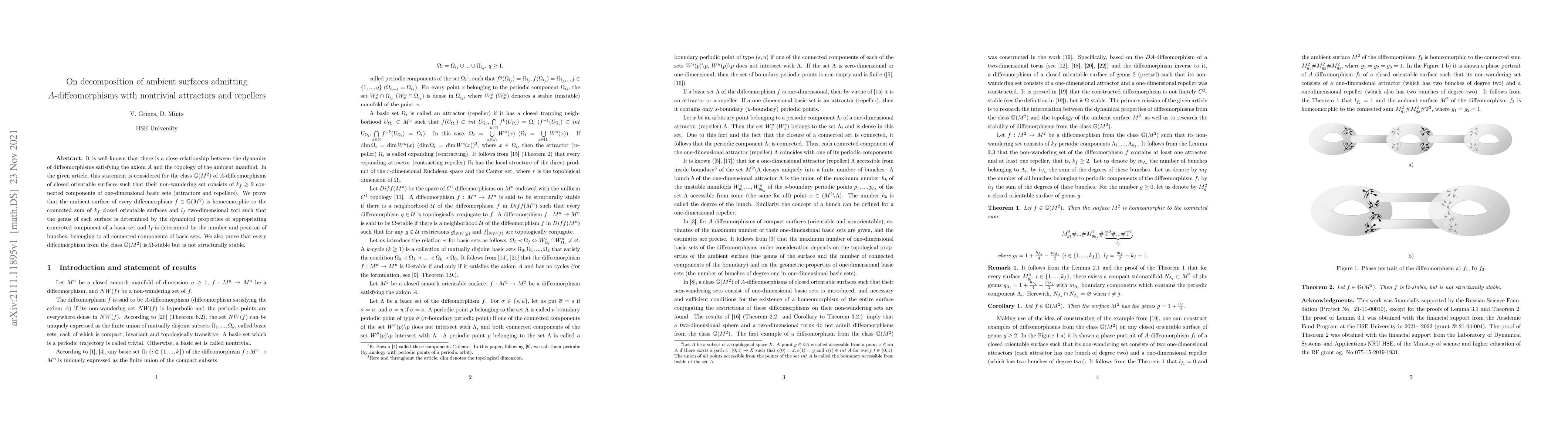 This paper investigates the topological decomposition of ambient surfaces admitting $A$-diffeomorphisms with nontrivial attractors and repellers. It proves that such surfaces are homeomorphic to connected sums of closed orientable surfaces and tori, with their genus determined by dynamical properties.