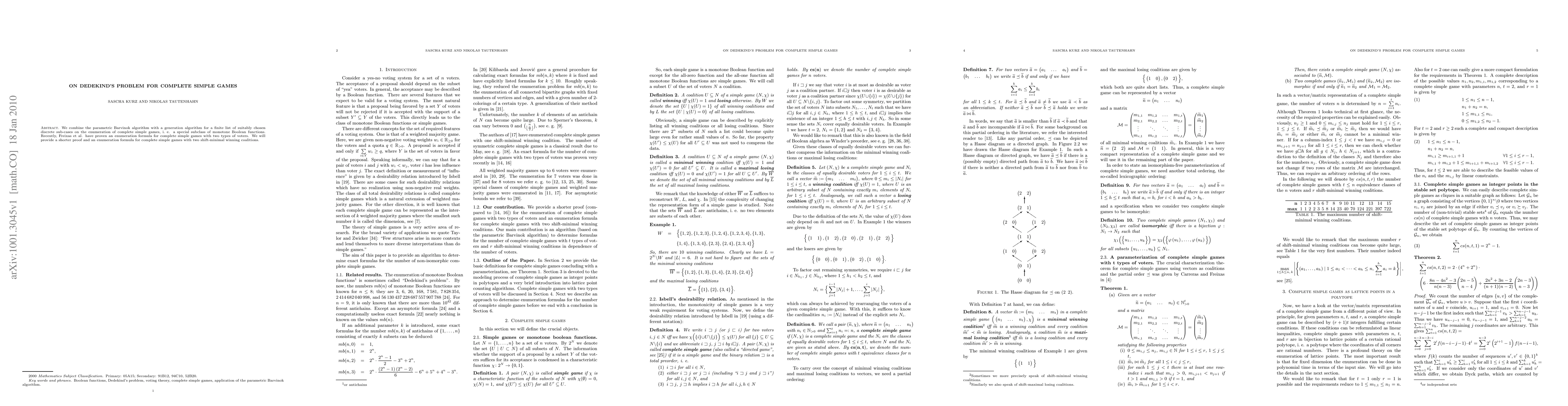 We combine the parametric Barvinok algorithm with a generation algorithm for a finite list of suitably chosen discrete sub-cases on the enumeration of complete simple games, i.e. a special subclass of monotone Boolean functions. Recently, Freixas et al. have proven an enumeration formula for complete simple games with two types of voters. We will provide a shorter proof and an enumeration formula for complete simple games with two shift-minimal winning coalitions.
