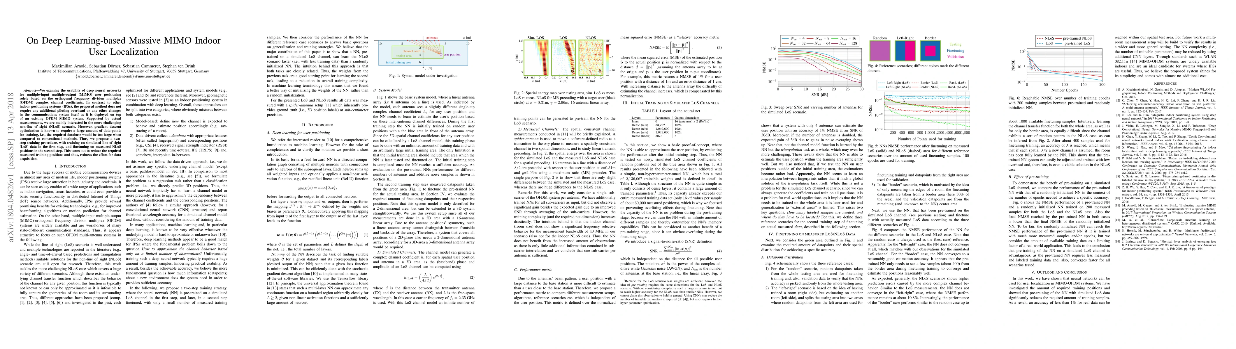 We examine the usability of deep neural networks for multiple-input multiple-output (MIMO) user positioning solely based on the orthogonal frequency division multiplex (OFDM) complex channel coefficients. In contrast to other indoor positioning systems (IPSs), the proposed method does not require any additional piloting overhead or any other changes in the communications system itself as it is deployed on top of an existing OFDM MIMO system. Supported by actual measurements, we are mainly interested in the more challenging non-line of sight (NLoS) scenario. However, gradient descent optimization is known to require a large amount of data-points for training, i.e., the required database would be too large when compared to conventional methods. Thus, we propose a twostep training procedure, with training on simulated line of sight (LoS) data in the first step, and finetuning on measured NLoS positions in the second step. This turns out to reduce the required measured training positions and thus, reduces the effort for data acquisition.
