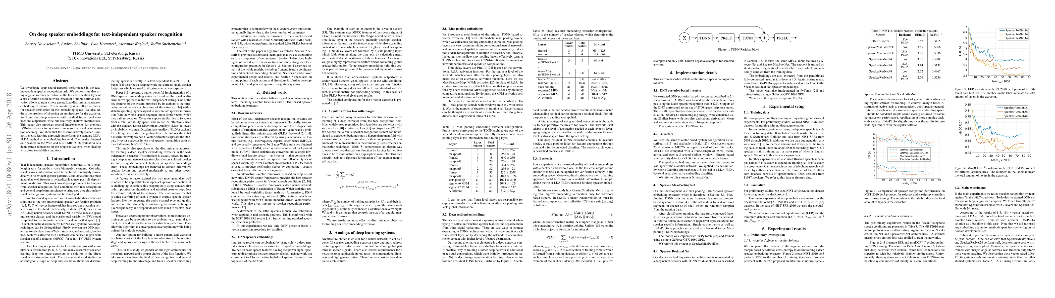 The paper introduces angular softmax activation, deep residual TDNN architectures, and cosine similarity metric learning for improved speaker recognition in text-independent conditions.