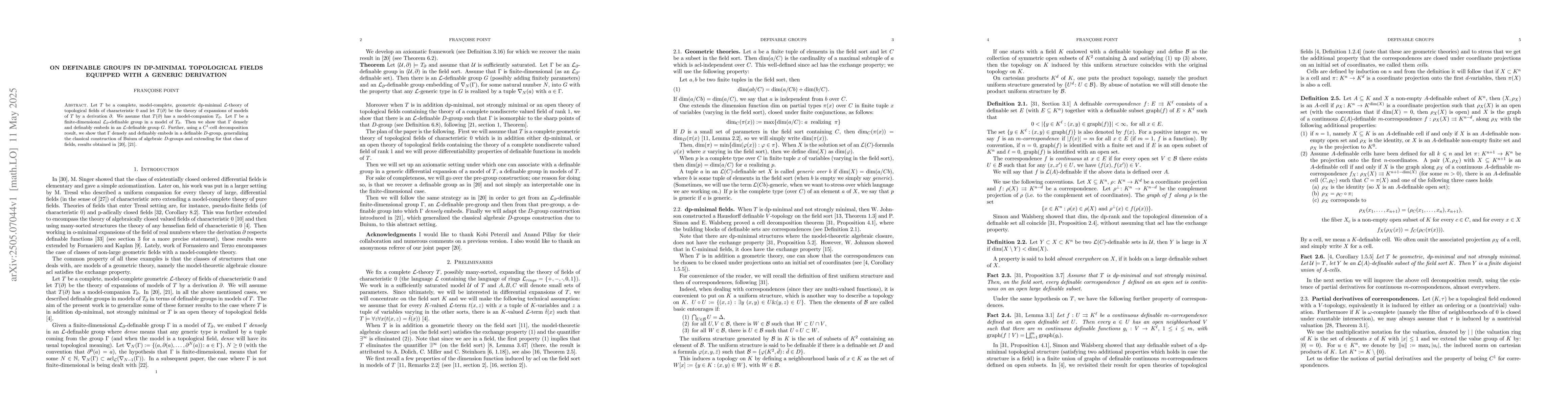The research explores dp-minimal topological fields with a generic derivation, focusing on definable groups within model-companion theories and their embeddings into $\mathcal{L}$-definable groups and definable $D$-groups.