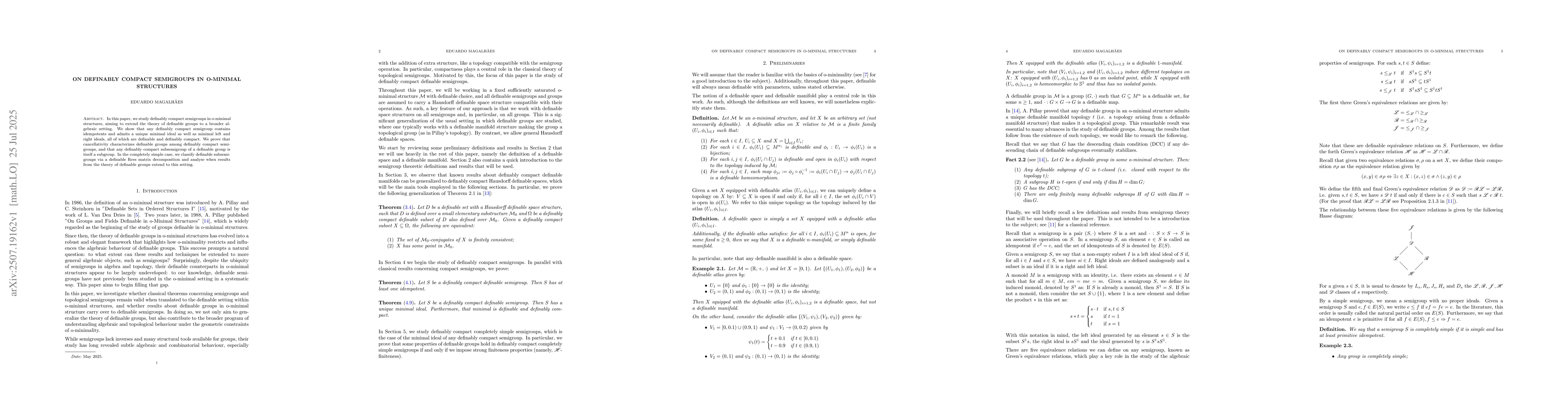In this paper, we study definably compact semigroups in o-minimal structures, aiming to extend the theory of definable groups to a broader algebraic setting. We show that any definably compact semigroup contains idempotents and admits a unique minimal ideal as well as minimal left and right ideals, all of which are definable and definably compact. We prove that cancellativity characterizes definable groups among definably compact semigroups, and that any definably compact subsemigroup of a definable group is itself a subgroup. In the completely simple case, we classify definable subsemigroups via a definable Rees matrix decomposition and analyse when results from the theory of definable groups extend to this setting.