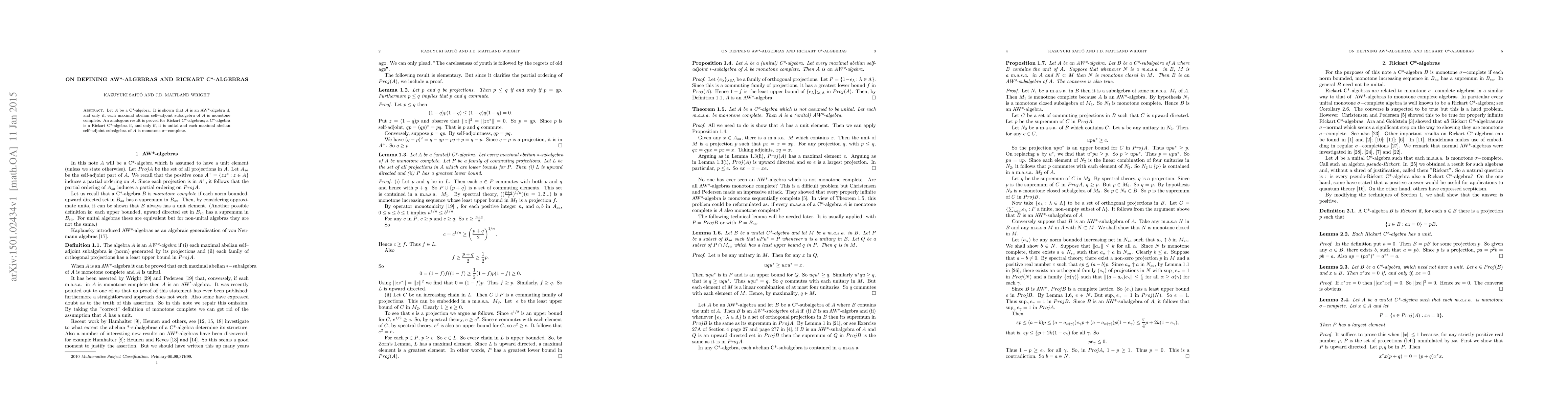 This paper defines AW*-algebras and Rickart C*-algebras by showing that an algebra A is an AW*-algebra if each maximal abelian self-adjoint subalgebra is monotone complete, and a Rickart C*-algebra if it is unital and each maximal abelian self-adjoint subalgebra is monotone σ-complete.