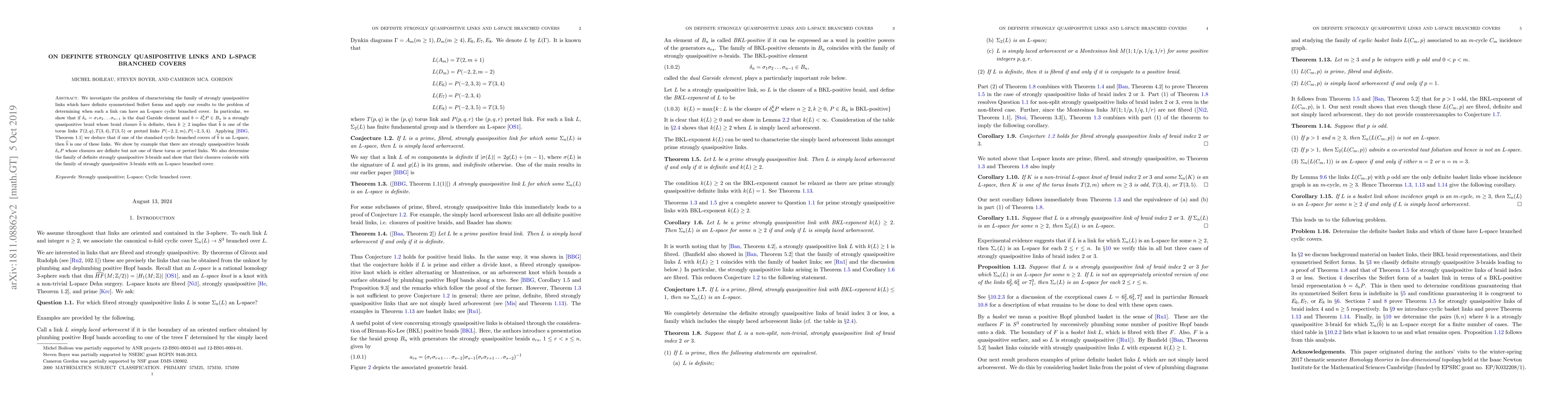 We investigate the problem of characterising the family of strongly quasipositive links which have definite symmetrised Seifert forms and apply our results to the problem of determining when such a link can have an L-space cyclic branched cover. In particular, we show that if $\delta_n = \sigma_1 \sigma_2 \ldots \sigma_{n-1}$ is the dual Garside element and $b = \delta_n^k P \in B_n$ is a strongly quasipositive braid whose braid closure $\widehat b$ is definite, then $k \geq 2$ implies that $\widehat b$ is one of the torus links $T(2, q), T(3,4), T(3,5)$ or pretzel links $P(-2, 2, m), P(-2,3,4)$. Applying Theorem 1.1 of our previous paper we deduce that if one of the standard cyclic branched covers of $\widehat b$ is an L-space, then $\widehat b$ is one of these links. We show by example that there are strongly quasipositive braids $\delta_n P$ whose closures are definite but not one of these torus or pretzel links. We also determine the family of definite strongly quasipositive $3$-braids and show that their closures coincide with the family of strongly quasipositive $3$-braids with an L-space branched cover.