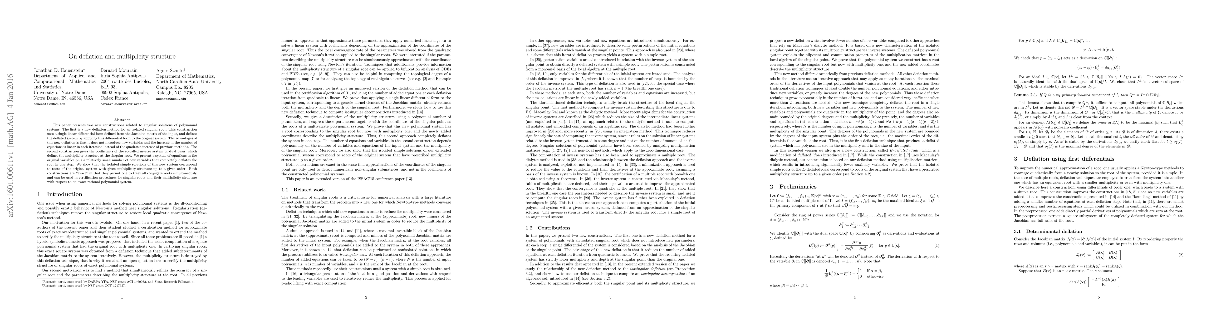 This paper presents two new constructions related to singular solutions of polynomial systems. The first is a new deflation method for an isolated singular root. This construction uses a single linear differential form defined from the Jacobian matrix of the input, and defines the deflated system by applying this differential form to the original system. The advantages of this new deflation is that it does not introduce new variables and the increase in the number of equations is linear in each iteration instead of the quadratic increase of previous methods. The second construction gives the coefficients of the so-called inverse system or dual basis, which defines the multiplicity structure at the singular root. We present a system of equations in the original variables plus a relatively small number of new variables that completely deflates the root in one step. We show that the isolated simple solutions of this new system correspond to roots of the original system with given multiplicity structure up to a given order. Both constructions are "exact" in that they permit one to treat all conjugate roots simultaneously and can be used in certification procedures for singular roots and their multiplicity structure with respect to an exact rational polynomial system.