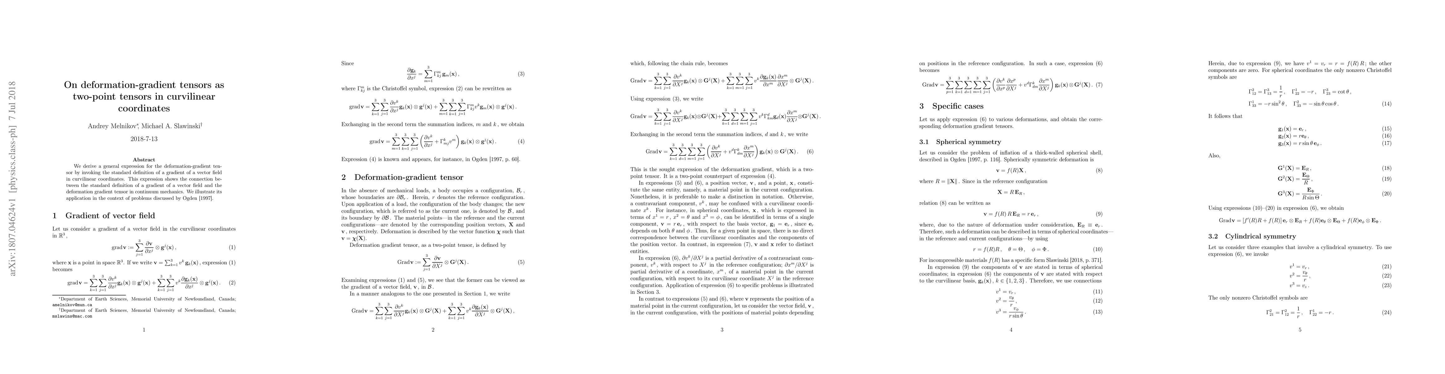 We derive a general expression for the deformation-gradient tensor by invoking the standard definition of a gradient of a vector field in curvilinear coordinates. This expression shows the connection between the standard definition of a gradient of a vector field and the deformation gradient tensor in continuum mechanics. We illustrate its application in the context of problems discussed by Ogden [1997].