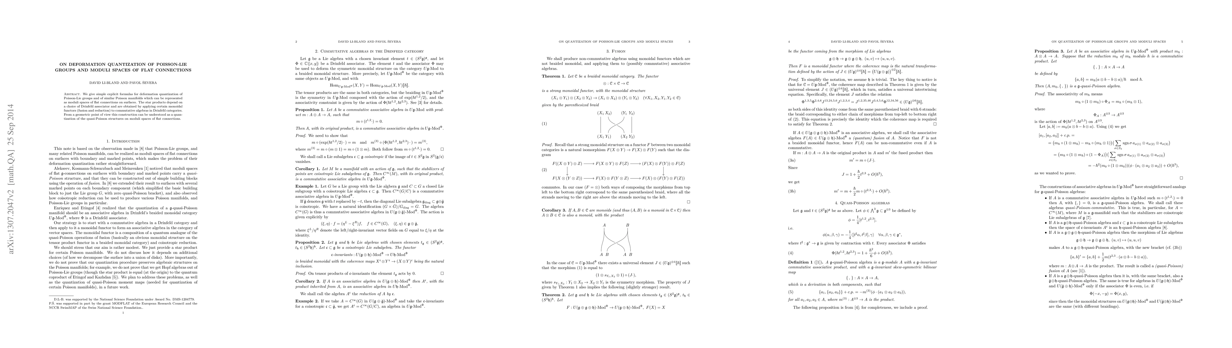 We give simple explicit formulas for deformation quantization of Poisson-Lie groups and of similar Poisson manifolds which can be represented as moduli spaces of flat connections on surfaces. The star products depend on a choice of Drinfe\v{l}d associator and are obtained by applying certain monoidal functors (fusion and reduction) to commutative algebras in Drinfe\v{l}d categories. From a geometric point of view this construction can be understood as a quantization of the quasi-Poisson structures on moduli spaces of flat connections.