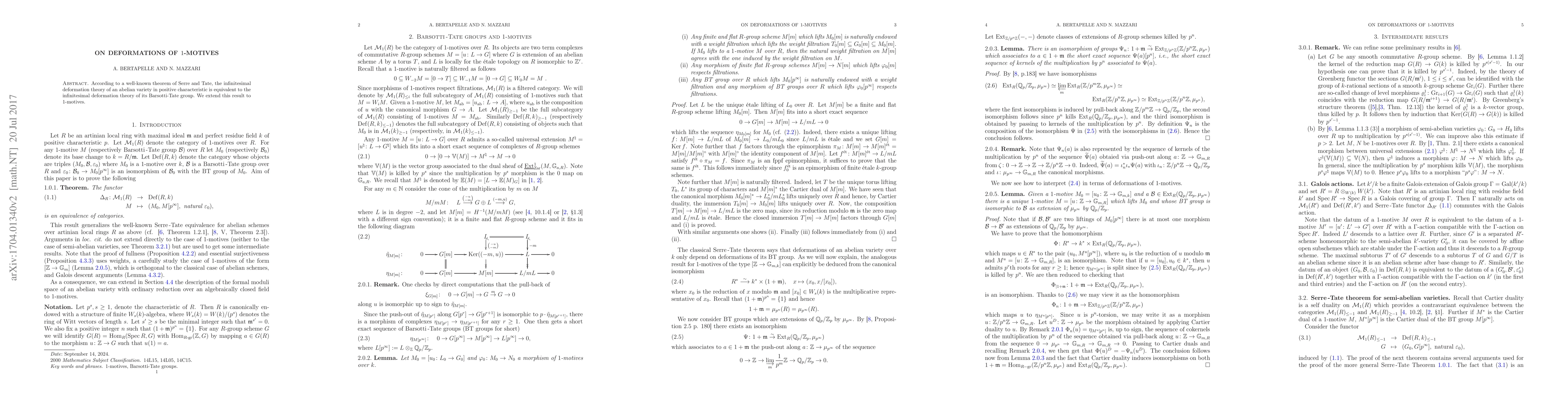 According to a well-known theorem of Serre and Tate, the infinitesimal deformation theory of an abelian variety in positive characteristic is equivalent to the infinitesimal deformation theory of its Barsotti-Tate group. We extend this result to $1$-motives.