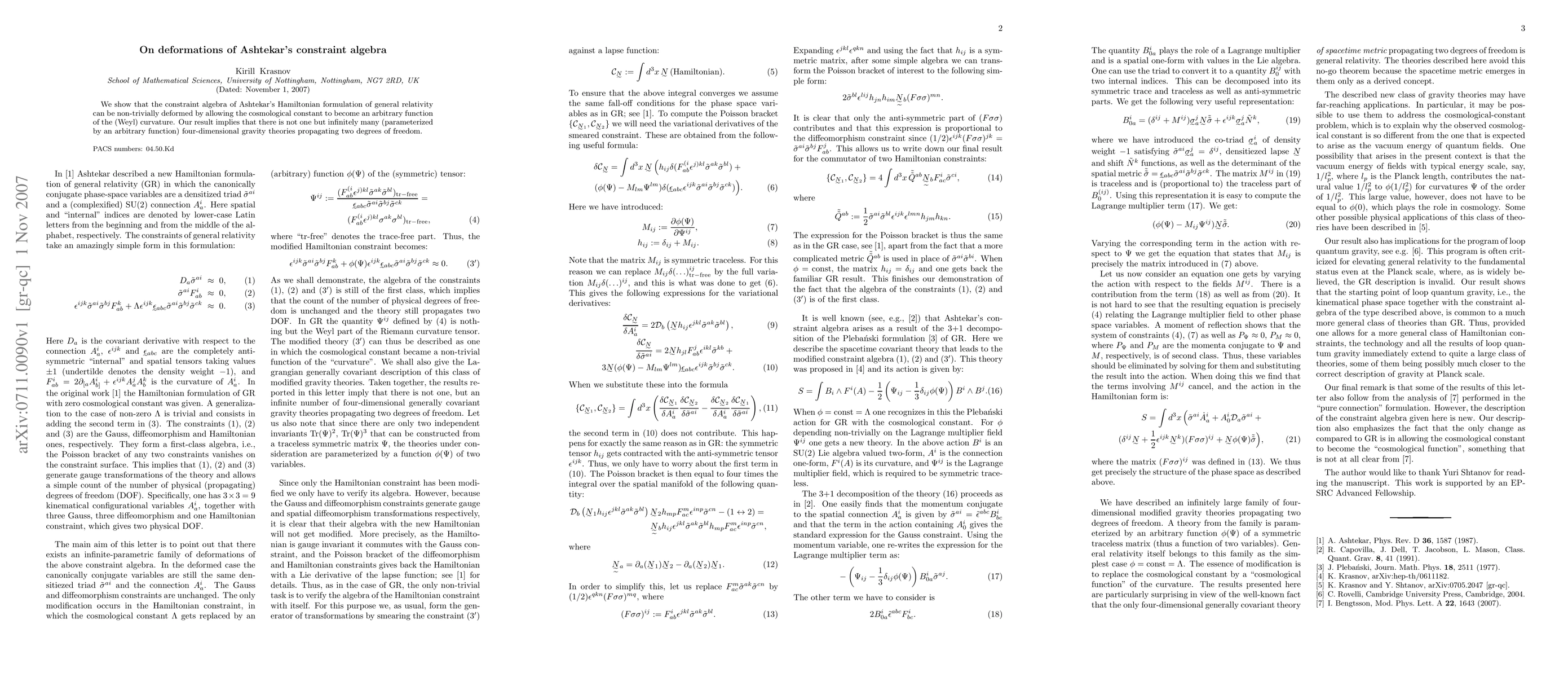 We show that the constraint algebra of Ashtekar's Hamiltonian formulation of general relativity can be non-trivially deformed by allowing the cosmological constant to become an arbitrary function of the (Weyl) curvature. Our result implies that there is not one but infinitely many (parameterized by an arbitrary function) four-dimensional gravity theories propagating two degrees of freedom.