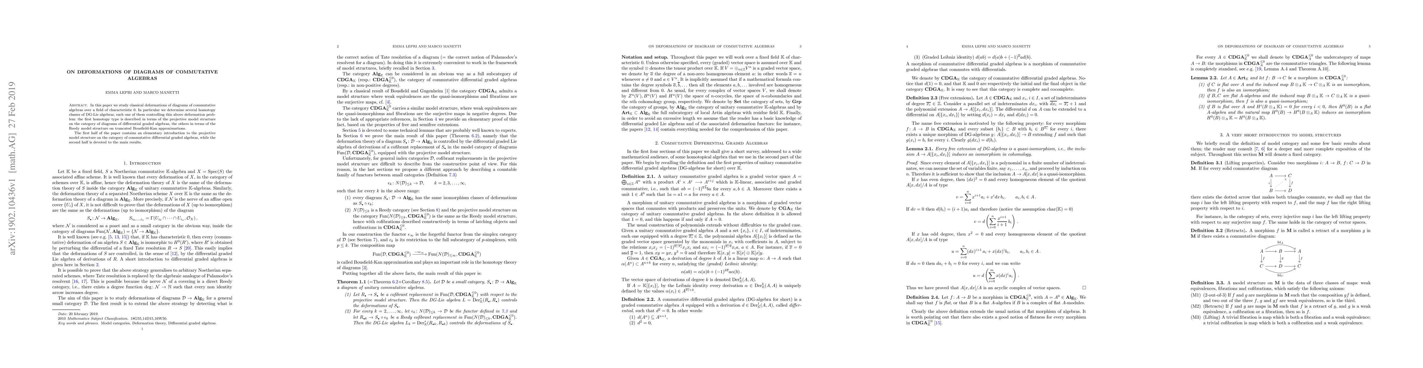 This paper explores classical deformations of diagrams of commutative algebras over a characteristic 0 field, identifying various homotopy classes of DG-Lie algebras that govern these deformations. It introduces the projective model structure on commutative differential graded algebras and uses the Reedy model structure on truncated Bousfield-Kan approximations for more complex results.
