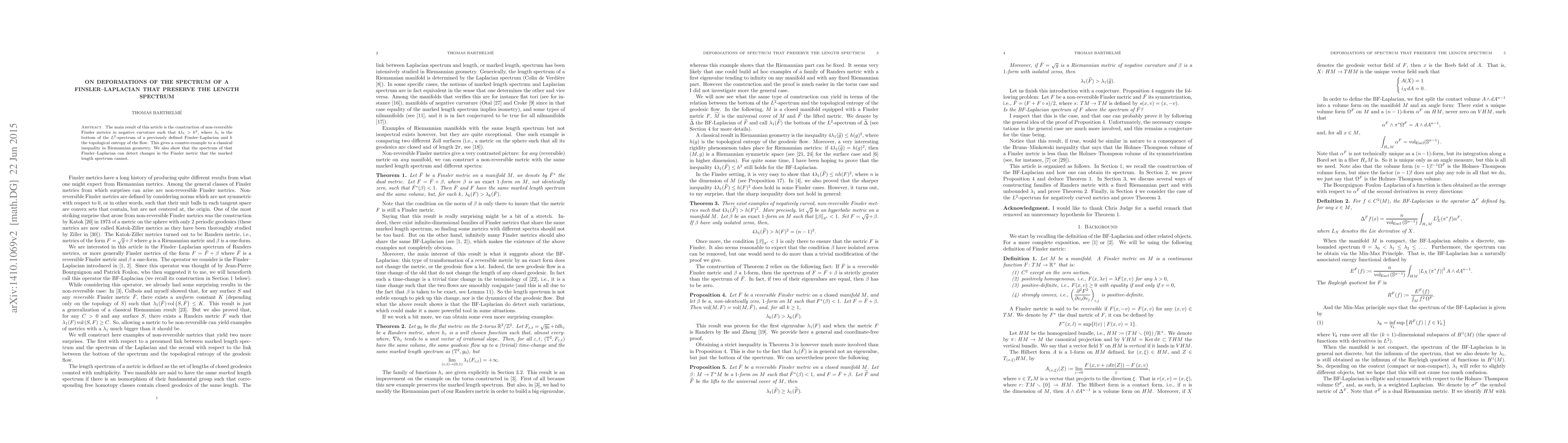In this article, we show that a Finsler--Laplacian introduced previously can detect changes in the Finsler metric that the marked length spectrum cannot. We also construct examples of non-reversible Finsler metrics in negative curvature such that $4\lambda_1 > h^2$, where $\lambda_1$ is the bottom of the $L^2$-spectrum and $h$ the topological entropy of the flow.