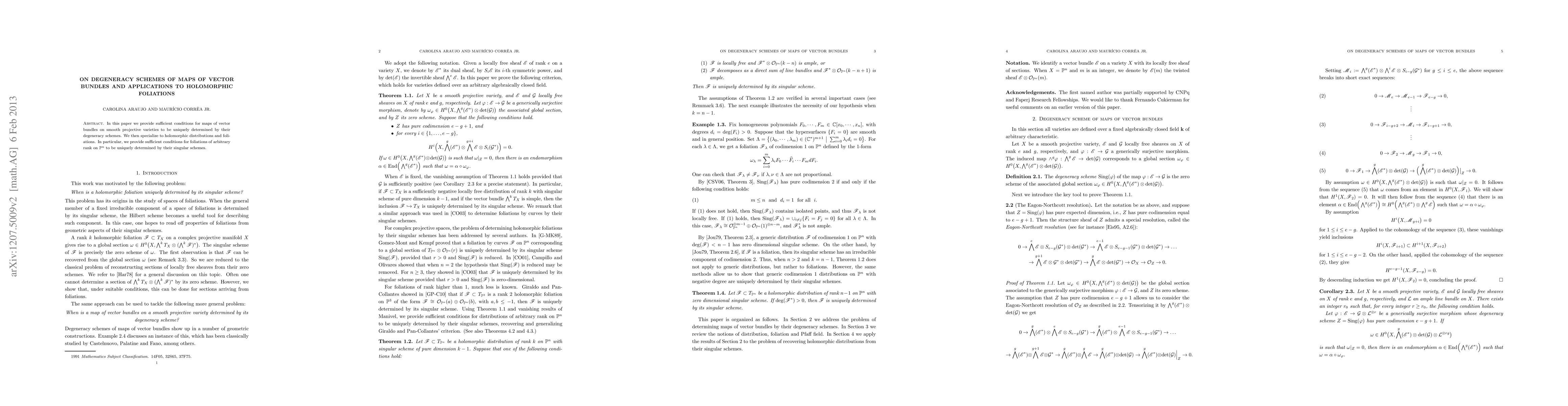 In this paper we provide sufficient conditions for maps of vector bundles on smooth projective varieties to be uniquely determined by their degeneracy schemes. We then specialize to holomorphic distributions and foliations. In particular, we provide sufficient conditions for distributions of arbitrary rank on projective spaces to be uniquely determined by their singular schemes.
