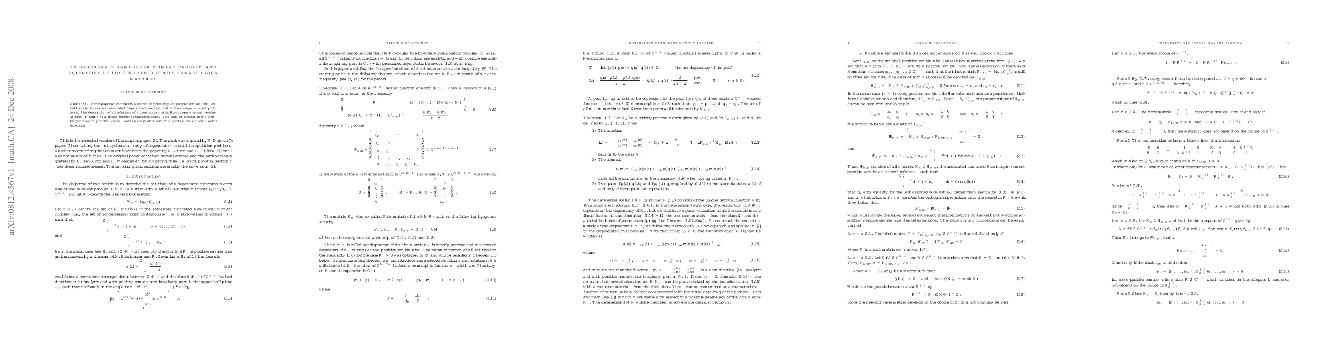 This paper explores the degenerate Hamburger moment problem and its connection to singular positive semidefinite Hankel block matrices, providing a solution description via a linear fractional transformation, particularly focusing on cases where the Hankel block matrix has a positive semidefinite extension.
