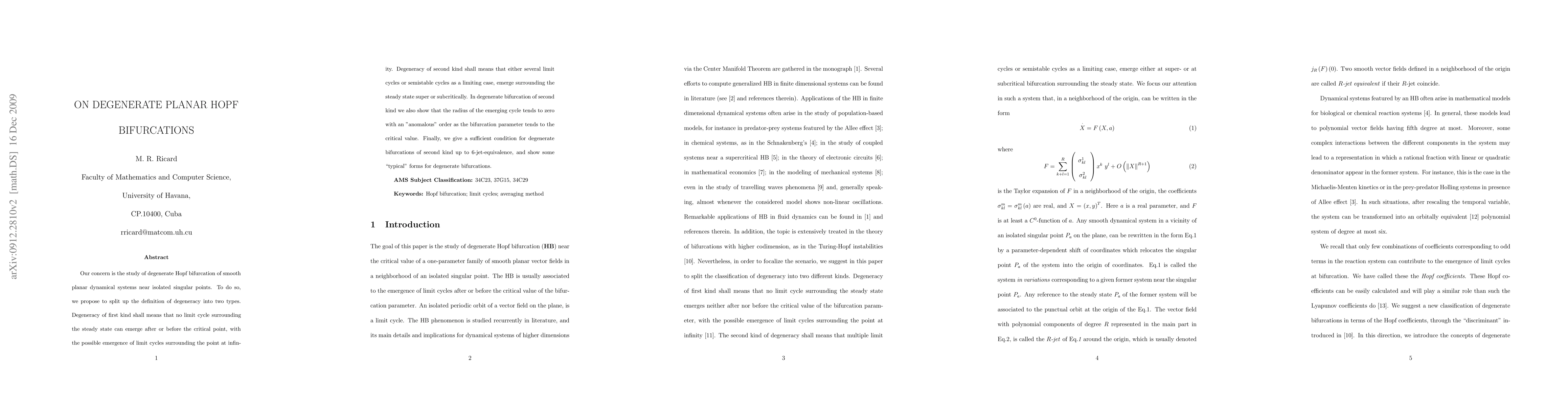 Our concern is the study of degenerate Hopf bifurcation of smooth planar dynamical systems near isolated singular points. To do so, we propose to split up the definition of degeneracy into two types. Degeneracy of first kind shall means that no limit cycle surrounding the steady state can emerge after or before the critical point, with the possible emergence of limit cycles surrounding the point at infinity. Degeneracy of second kind shall means that either several limit cycles or semistable cycles as a limiting case, emerge surrounding the steady state super or subcritically. In degenerate bifurcation of second kind we also show that the radius of the emerging cycle tends to zero with an "anomalous" order as the bifurcation parameter tends to the critical value. Finally, we give a sufficient condition for degenerate bifurcations of second kind up to 6-jet-equivalence, and show some "typical" forms for degenerate bifurcations.