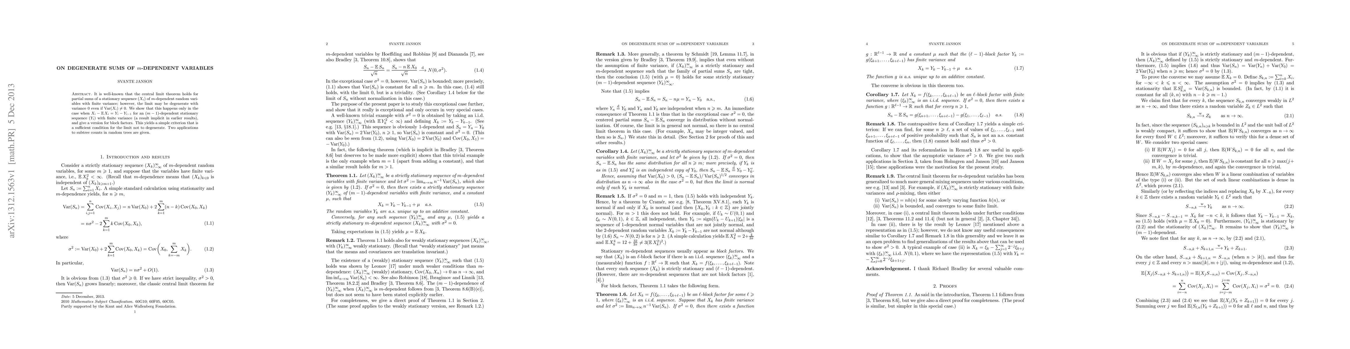 It is well-known that the central limit theorem holds for partial sums of a stationary sequence $(X_i)$ of $m$-dependent random variables with finite variance; however, the limit may be degenerate with variance 0 even if $\mathrm{Var}(X_i)\neq0$. We show that this happens only in the case when $X_i-\mathbb E X_i=Y_i-Y_{i-1}$ for an $(m-1)$-dependent stationary sequence $(Y_i)$ with finite variance (a result implicit in earlier results), and give a version for block factors. This yields a simple criterion that is a sufficient condition for the limit not to degenerate. Two applications to subtree counts in random trees are given.