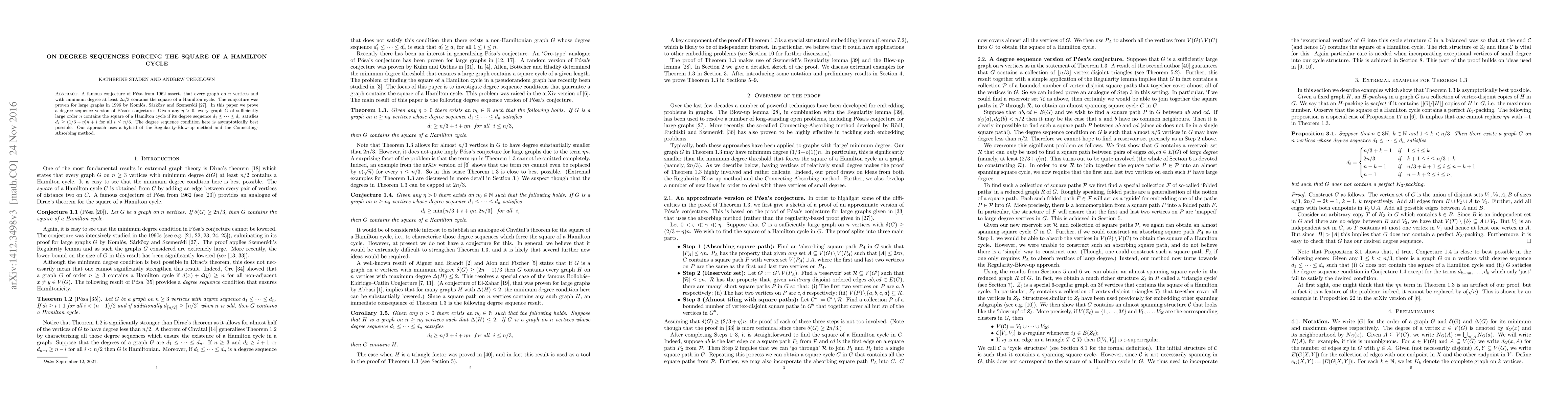 This paper proves a degree sequence version of P\'osa's conjecture, showing that for sufficiently large graphs, the square of a Hamilton cycle exists if the degree sequence satisfies $d_i \geq (1/3+\eta)n+i$ for all $i \leq n/3$. The authors employ a hybrid method combining Regularity-Blow-up and Connecting-Absorbing techniques.