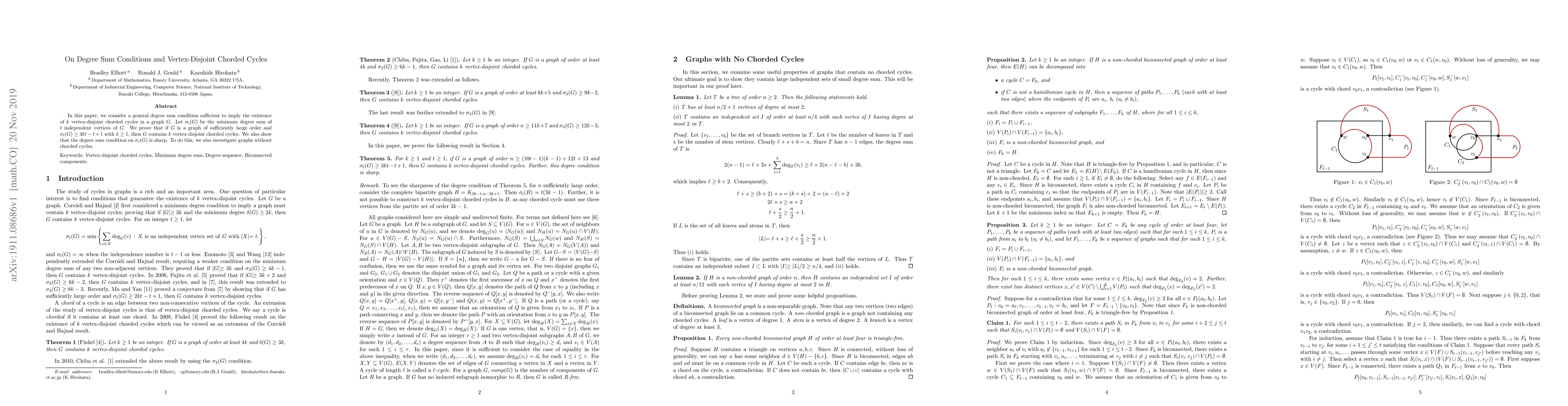 In this paper, we consider a general degree sum condition sufficient to imply the existence of $k$ vertex-disjoint chorded cycles in a graph $G$. Let $\sigma_t(G)$ be the minimum degree sum of $t$ independent vertices of $G$. We prove that if $G$ is a graph of sufficiently large order and $\sigma_t(G)\geq 3kt-t+1$ with $k\geq 1$, then $G$ contains $k$ vertex-disjoint chorded cycles. We also show that the degree sum condition on $\sigma_t(G)$ is sharp. To do this, we also investigate graphs without chorded cycles.