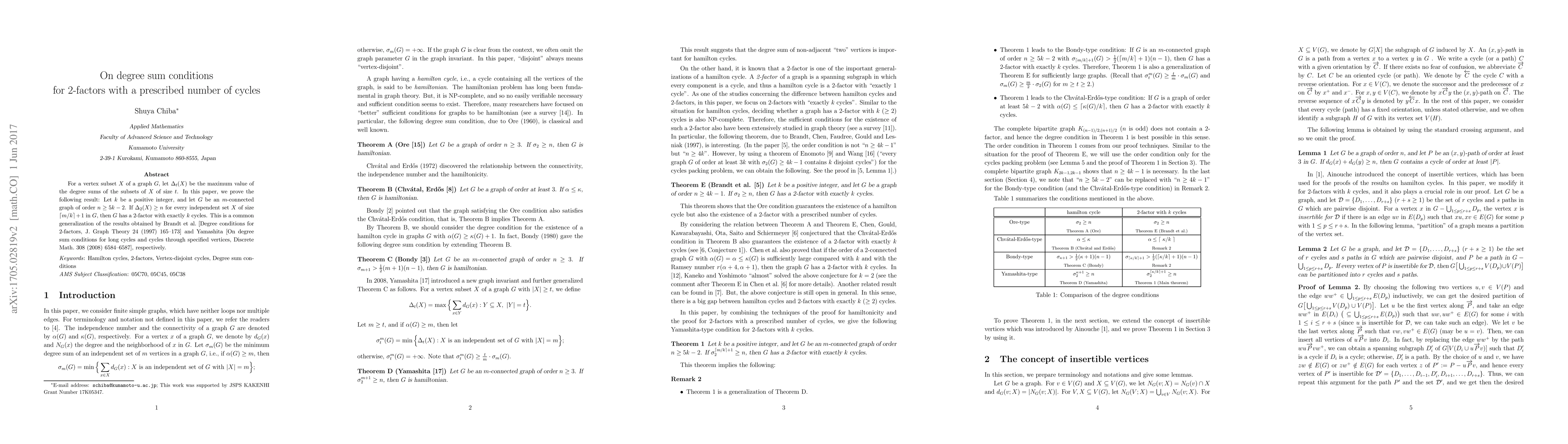 This paper proves that for an $m$-connected graph $G$ of order $n \ge 5k - 2$, if the maximum degree sum of any independent set of size $\lceil m/k \rceil + 1$ is at least $n$, then $G$ has a 2-factor with exactly $k$ cycles. This generalizes prior results by Brandt et al. and Yamashita on degree conditions for 2-factors.
