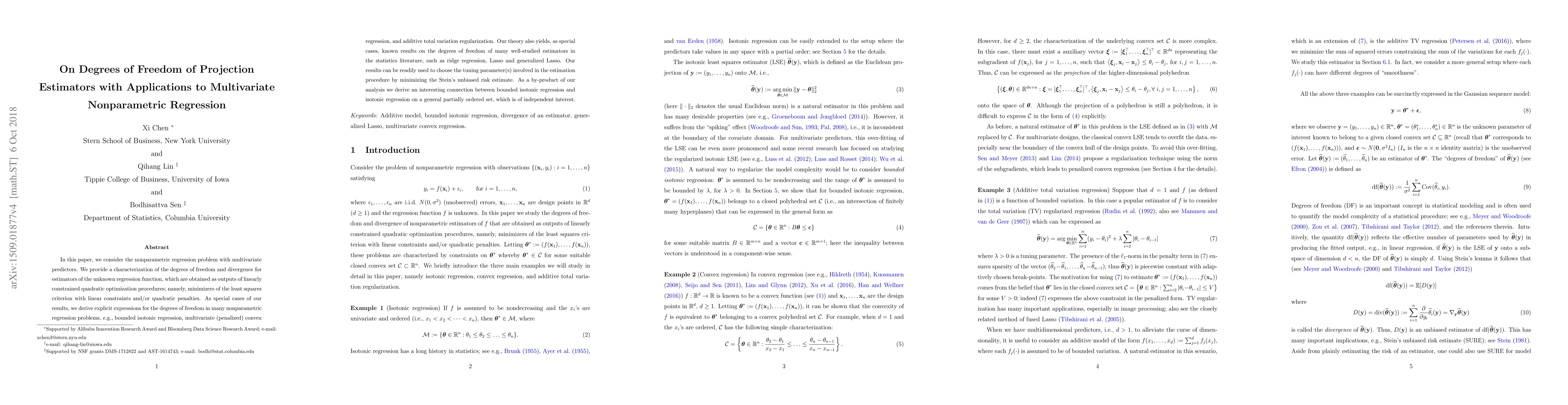 This paper characterizes the degrees of freedom and divergence for projection estimators in multivariate nonparametric regression, providing explicit expressions for various regression problems and linking them to well-known statistical estimators. The findings enable tuning parameter selection via minimizing the Stein's unbiased risk estimate.