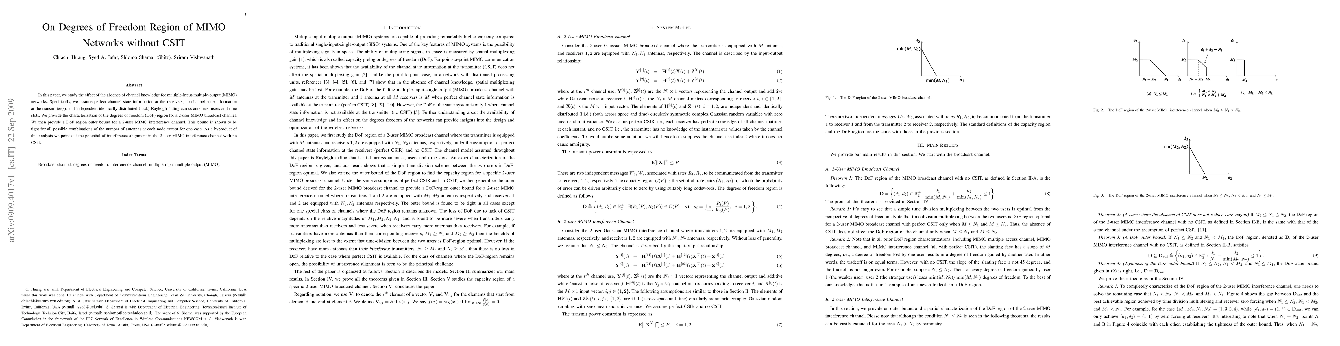 This paper investigates the degrees of freedom (DoF) region for MIMO networks lacking transmitter channel state information (CSIT). It characterizes the DoF region for a 2-user MIMO broadcast channel and provides a tight DoF outer bound for a 2-user MIMO interference channel, highlighting the potential of interference alignment in scenarios with no CSIT.