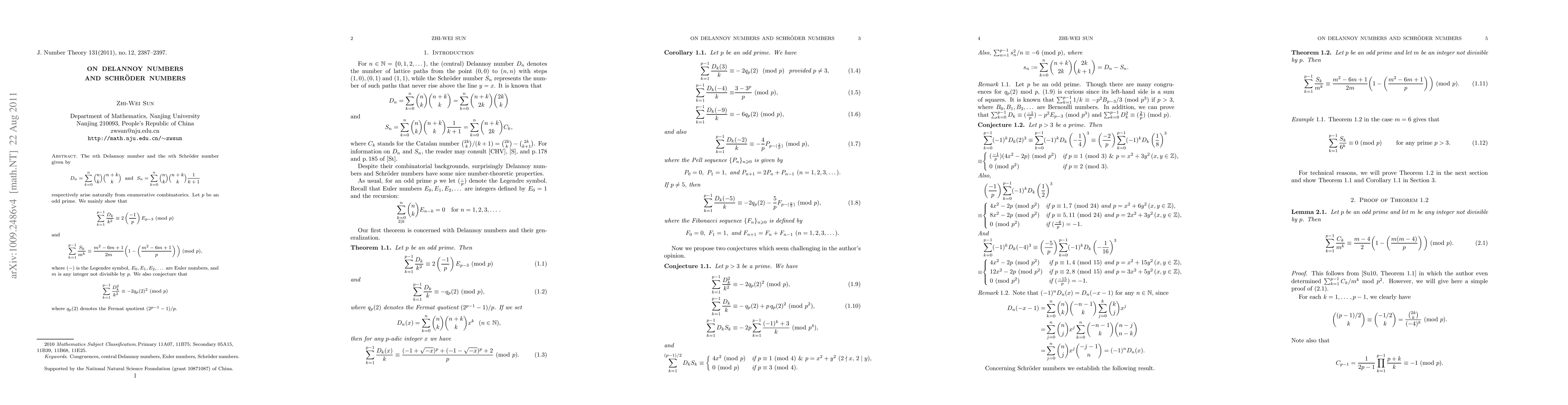 This paper explores the properties of Delannoy and Schröder numbers, proving congruences modulo an odd prime p for their sums divided by powers of integers. It establishes specific results involving the Legendre symbol and Euler numbers, and conjectures a similar congruence for the sum of squares of Delannoy numbers divided by squares of integers.