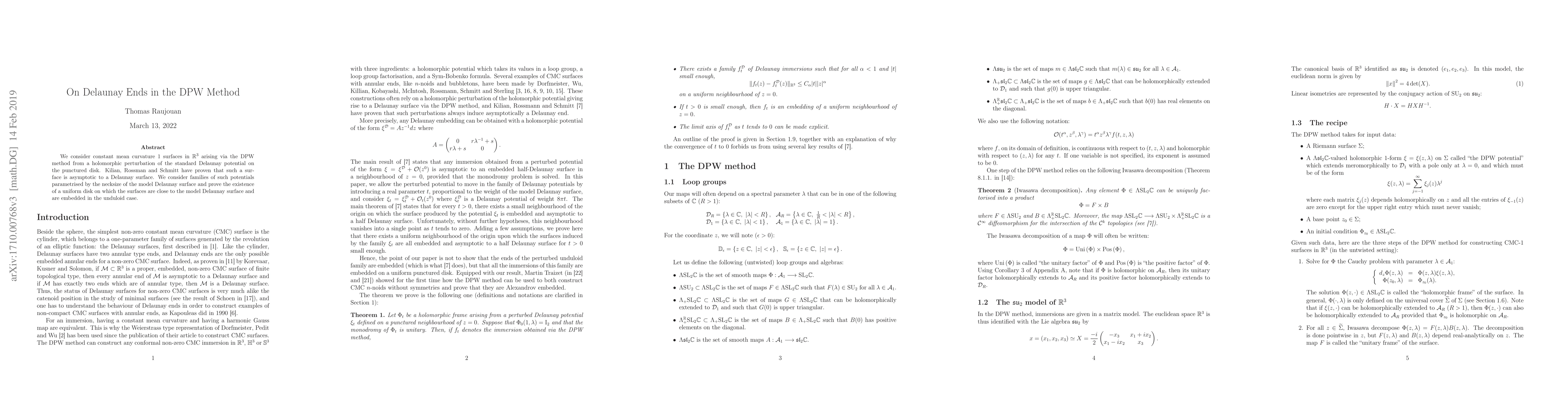 This paper investigates constant mean curvature 1 surfaces in $\mathbb{R}^3$ generated by the DPW method from holomorphic perturbations of the Delaunay potential. The authors prove that these surfaces are asymptotically close to Delaunay surfaces and establish the existence of a uniform disk where the surfaces remain embedded and close to the model in the unduloid case.