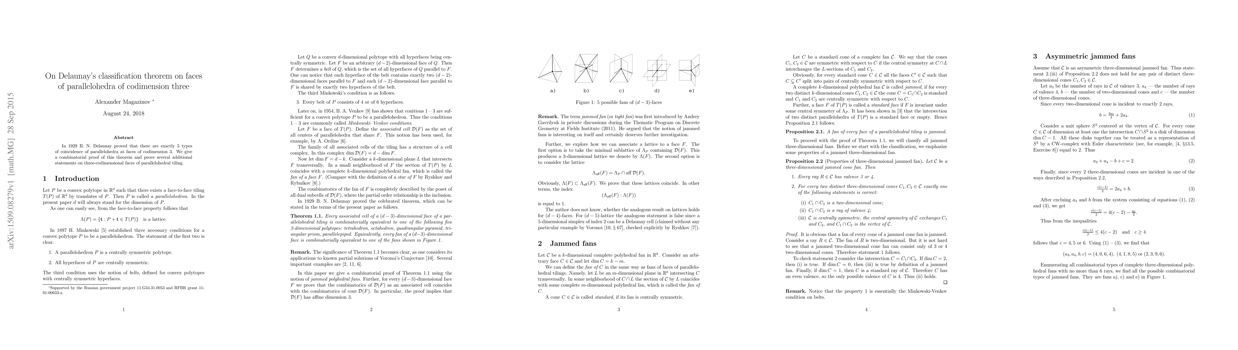 In 1929 B.~N.~Delaunay proved that there are exactly 5 types of coincidence of parallelohedra at faces of codimension 3. We give a combinatorial proof of this theorem and prove several additional statements on three-codimensional faces of parallelohedral tiling. -- The original paper appeared in 2013 in MAIS (see the bibref) and was in Russian. This is the English version.