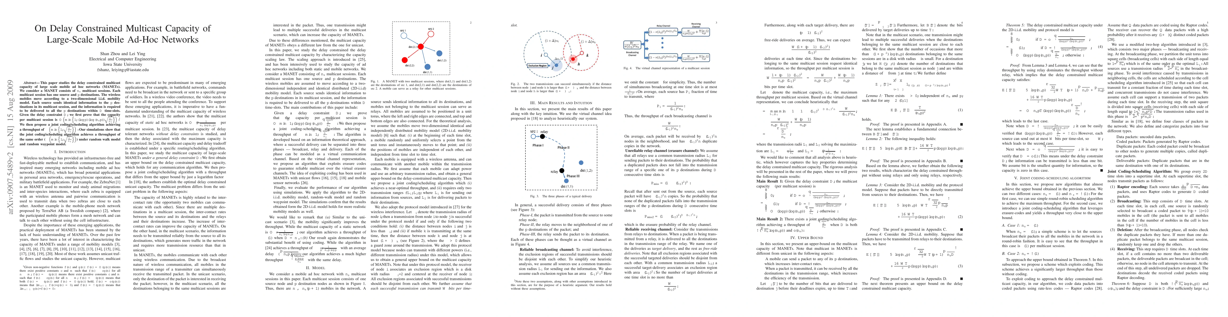 This paper studies the delay constrained multicast capacity of large scale mobile ad hoc networks (MANETs). We consider a MANET consists of $n_s$ multicast sessions. Each multicast session has one source and $p$ destinations. The wireless mobiles move according to a two-dimensional i.i.d. mobility model. Each source sends identical information to the $p$ destinations in its multicast session, and the information is required to be delivered to all the $p$ destinations within $D$ time-slots. Given the delay constraint $D,$ we first prove that the capacity per multicast session is $O(\min\{1, (\log p)(\log (n_sp)) \sqrt{\frac{D}{n_s}}\}).$ Given non-negative functions $f(n)$ and $g(n)$: $f(n)=O(g(n))$ means there exist positive constants $c$ and $m$ such that $f(n) \leq cg(n)$ for all $ n\geq m;$ $f(n)=\Omega(g(n))$ means there exist positive constants $c$ and $m$ such that $f(n)\geq cg(n)$ for all $n\geq m;$ $f(n)=\Theta(g(n))$ means that both $f(n)=\Omega(g(n))$ and $f(n)=O(g(n))$ hold; $f(n)=o(g(n))$ means that $\lim_{n\to \infty} f(n)/g(n)=0;$ and $f(n)=\omega(g(n))$ means that $\lim_{n\to \infty} g(n)/f(n)=0.$ We then propose a joint coding/scheduling algorithm achieving a throughput of $\Theta(\min\{1,\sqrt{\frac{D}{n_s}}\}).$ Our simulations show that the joint coding/scheduling algorithm achieves a throughput of the same order ($\Theta(\min\{1, \sqrt{\frac{D}{n_s}}\})$) under random walk model and random waypoint model.