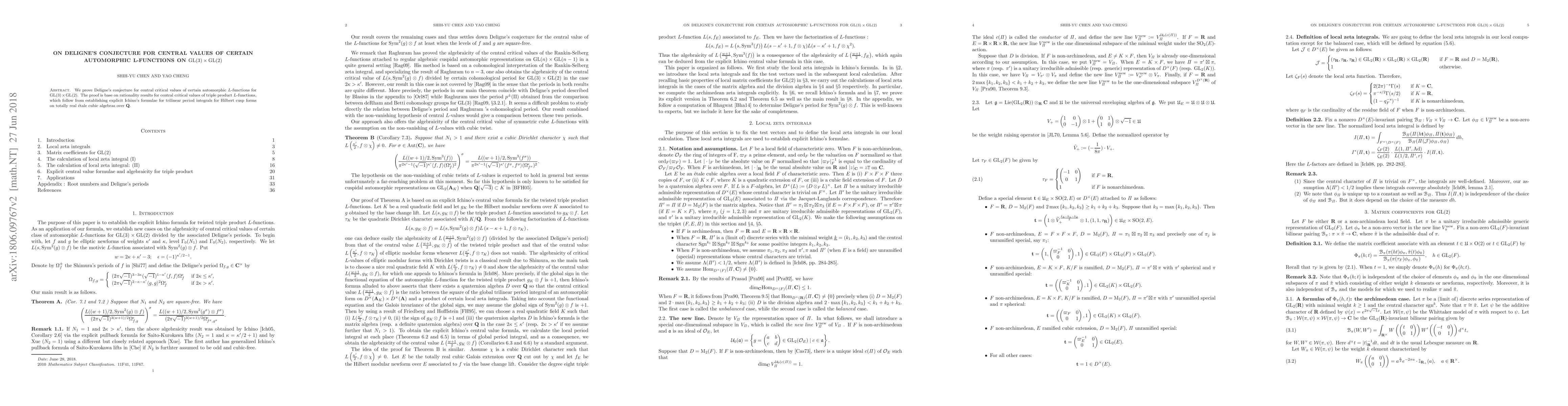 This paper proves Deligne's conjecture for central critical values of automorphic $L$-functions associated with ${\rm GL}(3)\times {\rm GL}(2)$, utilizing rationality results derived from explicit Ichino's formulae for trilinear period integrals of Hilbert cusp forms.