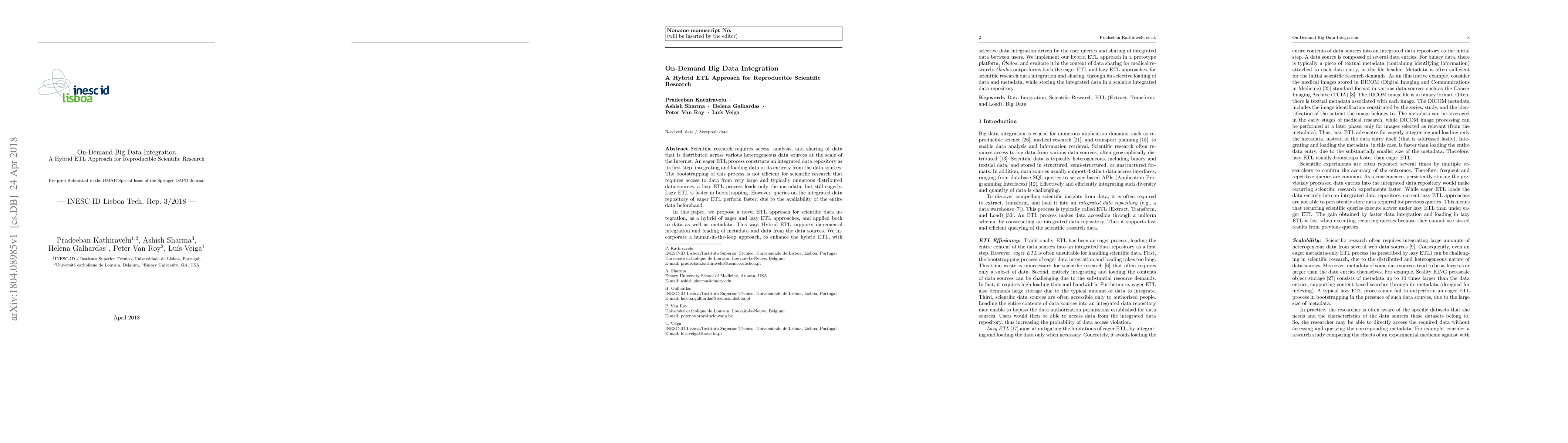This paper proposes a hybrid ETL approach for integrating large-scale scientific data from diverse sources, combining the benefits of eager and lazy ETL to enable incremental data and metadata loading. The hybrid method, implemented in the Obidos platform, outperforms traditional ETL methods by selectively loading data based on user queries, thus optimizing data sharing in medical research.