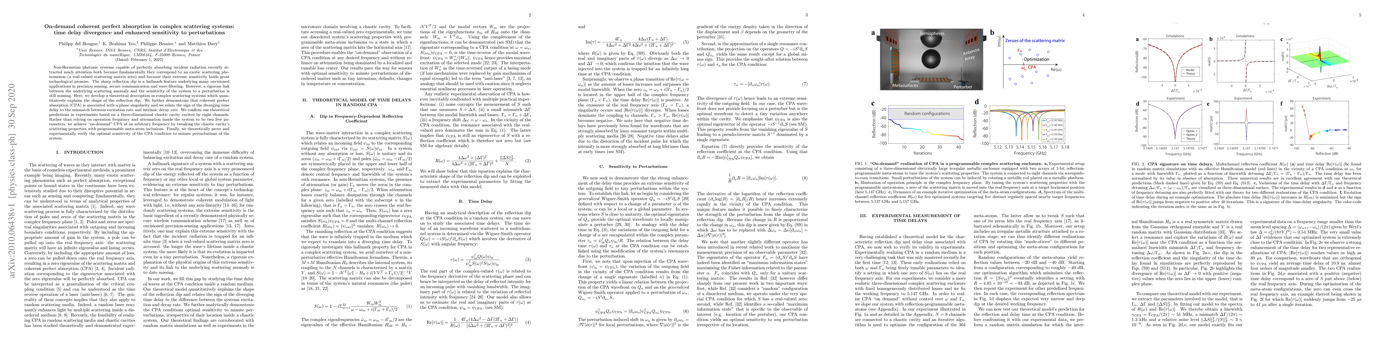 Non-Hermitian photonic systems capable of perfectly absorbing incident radiation recently attracted much attention both because fundamentally they correspond to an exotic scattering phenomenon (a real-valued scattering matrix zero) and because their extreme sensitivity holds great technological promise. The sharp reflection dip is a hallmark feature underlying many envisioned applications in precision sensing, secure communication and wave filtering. However, a rigorous link between the underlying scattering anomaly and the sensitivity of the system to a perturbation is still missing. Here, we develop a theoretical description in complex scattering systems which quantitatively explains the shape of the reflection dip. We further demonstrate that coherent perfect absorption (CPA) is associated with a phase singularity and we relate the sign of the diverging time delay to the mismatch between excitation rate and intrinsic decay rate. We confirm our theoretical predictions in experiments based on a three-dimensional chaotic cavity excited by eight channels. Rather than relying on operation frequency and attenuation inside the system to be two free parameters, we achieve "on-demand" CPA at an arbitrary frequency by tweaking the chaotic cavity's scattering properties with programmable meta-atom inclusions. Finally, we theoretically prove and experimentally verify the optimal sensitivity of the CPA condition to minute perturbations of the system.