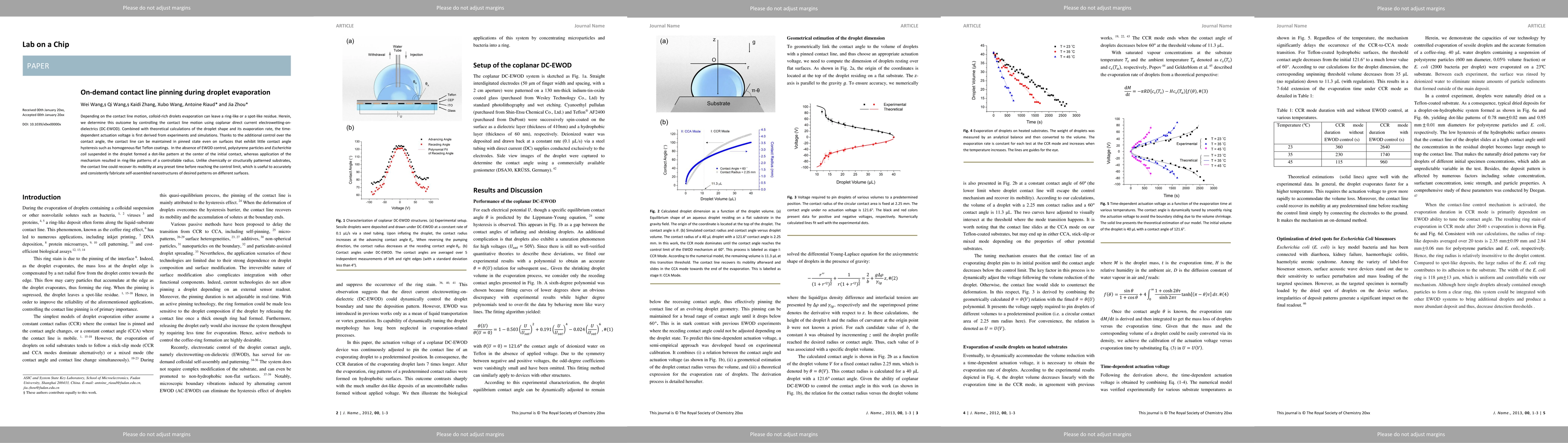 This research demonstrates on-demand control of droplet evaporation contact line motion using DC-EWOD, allowing for the formation of either ring-like or spot-like residues. The method enables precise pinning of the contact line on low hysteresis surfaces, facilitating customizable fabrication of self-assembled nanostructures.