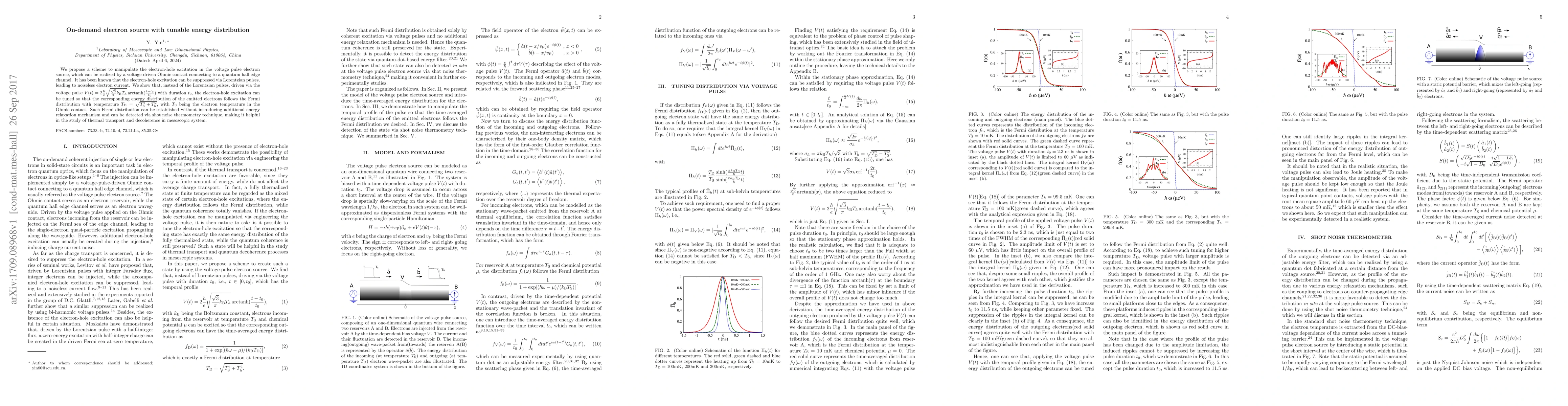 We propose a scheme to manipulate the electron-hole excitation in the voltage pulse electron source, which can be realized by a voltage-driven Ohmic contact connecting to a quantum hall edge channel. It has been known that the electron-hole excitation can be suppressed via Lorentzian pulses, leading to noiseless electron current. We show that, instead of the Lorentzian pulses, driven via the voltage pulse $V(t) = 2 \frac{\hbar}{e} \sqrt{\frac{\sqrt{3}}{\pi} k_{\rm B} T_h} \arctanh( \frac{t - t_0}{t_0} )$ with duration $t_0$, the electron-hole excitation can be tuned so that the corresponding energy distribution of the emitted electrons follows the Fermi distribution with temperature $T_{\rm D} = \sqrt{ T^2_{\rm S} + T^2_{\rm h} }$, with $T_{\rm S}$ being the electron temperature in the Ohmic contact. Such Fermi distribution can be established without introducing additional energy relaxation mechanism and can be detected via shot noise thermometry technique, making it helpful in the study of thermal transport and decoherence in mesoscopic system.