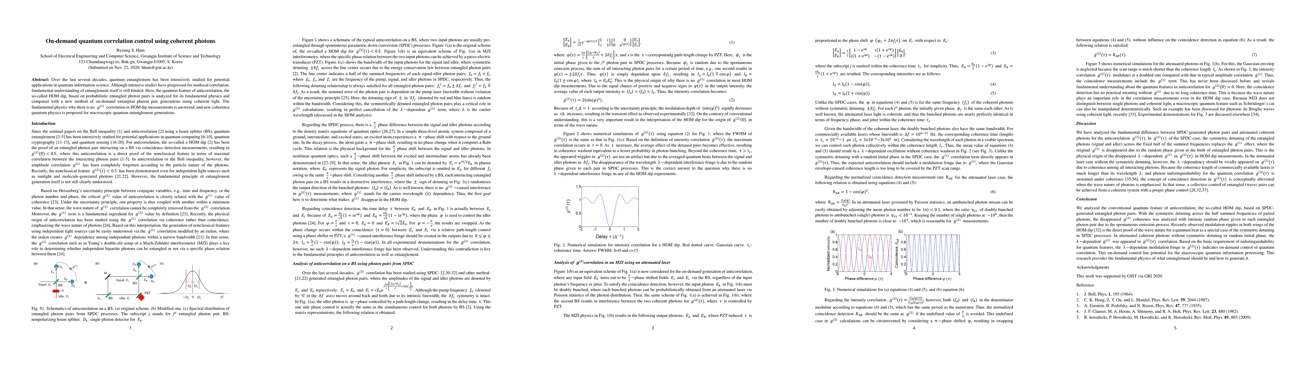 Over the last several decades, quantum entanglement has been intensively studied for potential applications in quantum information science. Although intensive studies have progressed for nonlocal correlation, fundamental understanding of entanglement itself is still limited. Here, the quantum feature of anticorrelation, the so-called HOM dip, based on probabilistic entangled photon pairs is analyzed for its fundamental physics and compared with a new method of on-demand entangled photon pair generations using coherent light. The fundamental physics why there is no g^((1)) correlation in HOM dip measurements is answered, and new coherence quantum physics is proposed for macroscopic quantum entanglement generations.
