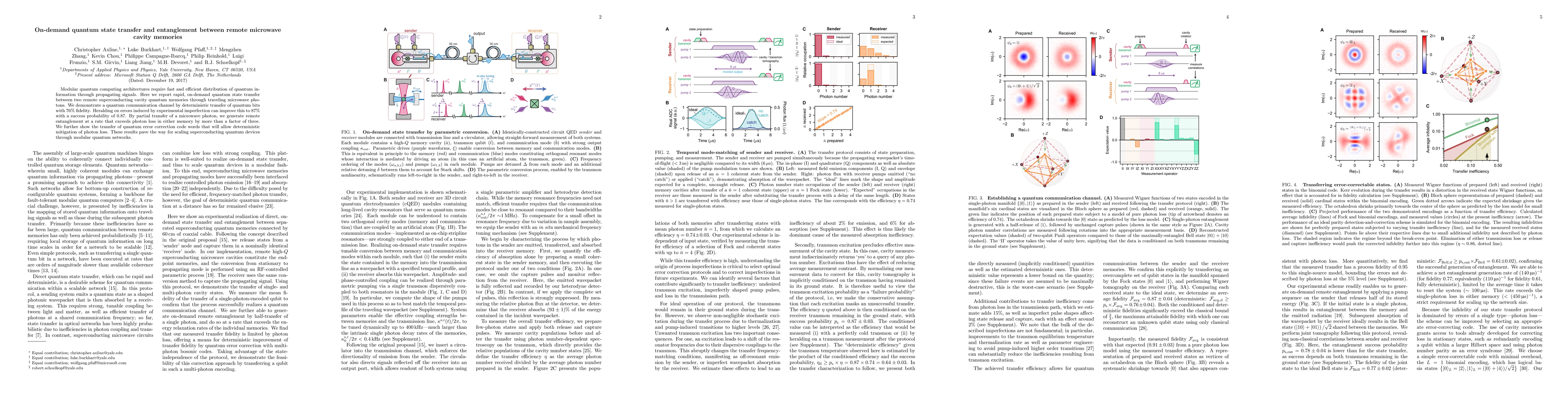 This paper reports on the successful on-demand transfer of quantum states and entanglement between remote superconducting cavity quantum memories using traveling microwave photons, achieving a fidelity of 87% with error correction. The study demonstrates a scalable approach for modular quantum computing architectures.