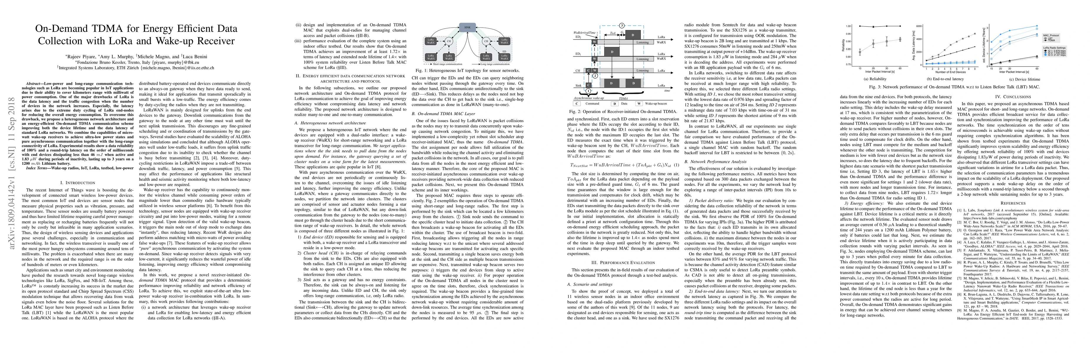 This paper proposes an energy-efficient On-demand TDMA communication scheme for LoRa networks, combining wake-up receivers to minimize energy consumption. Experimental results demonstrate 100% data reliability and millisecond latency, extending device lifetime to up to 3 years on a single battery.