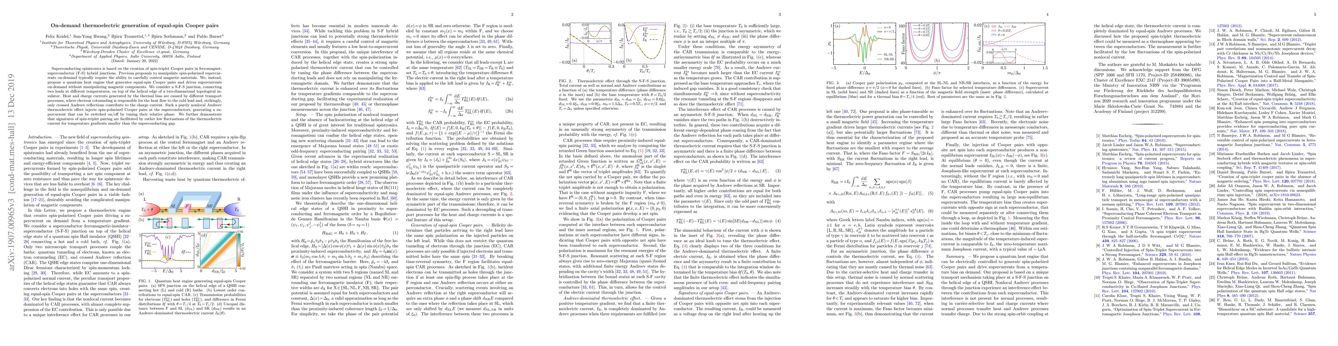 This paper proposes a quantum heat engine in a S-F-S junction to generate equal-spin Cooper pairs and on-demand supercurrents without manipulating magnetic materials. The thermoelectric effect via crossed Andreev reflections enables spin-polarized supercurrents, switchable by phase tuning, with minimal fluctuations for small temperature gradients.