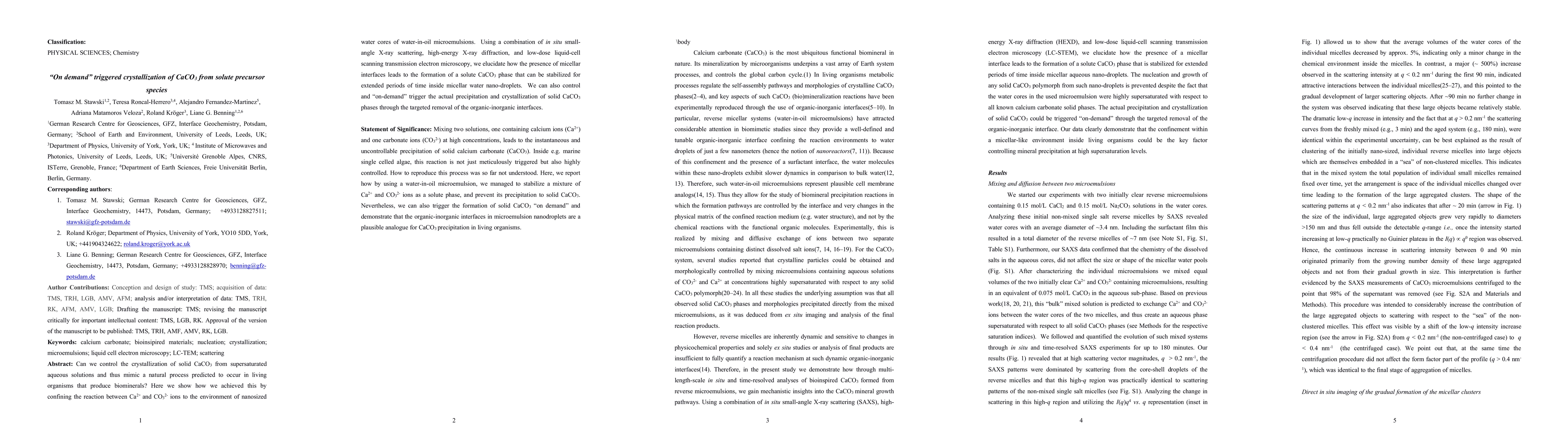 Can we control the crystallization of solid CaCO3 from supersaturated aqueous solutions and thus mimic a natural process predicted to occur in living organisms that produce biominerals? Here we show how we achieved this by confining the reaction between Ca2+ and CO32- ions to the environment of nanosized water cores of water-in-oil microemulsions. Using a combination of in situ small-angle X-ray scattering, high-energy X-ray diffraction, and low-dose liquid-cell scanning transmission electron microscopy, we elucidate how the presence of micellar interfaces leads to the formation of a solute CaCO3 phase that can be stabilized for extended periods of time inside micellar water nano-droplets. We can also control and >>on-demand<< trigger the actual precipitation and crystallization of solid CaCO3 phases through the targeted removal of the organic-inorganic interfaces.