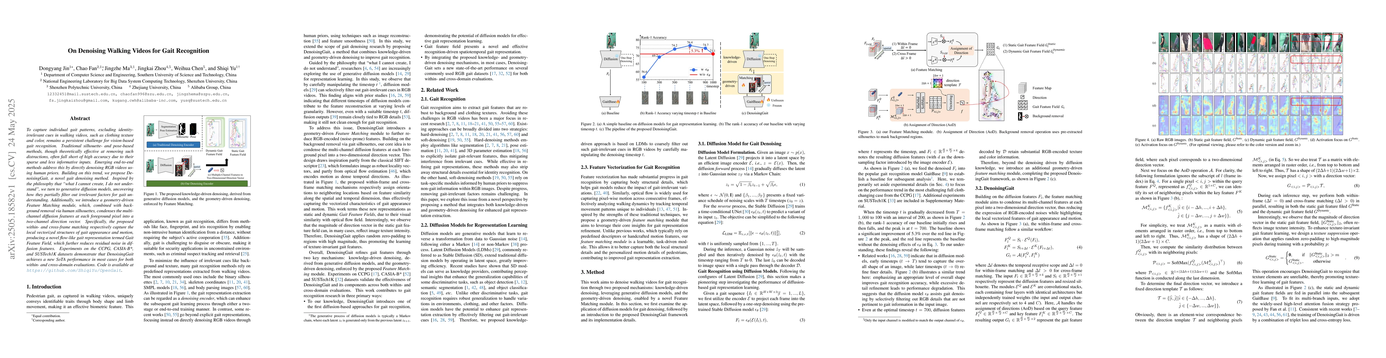 A new method called DenoisingGait improves gait recognition accuracy in walking videos by denoising RGB videos using generative diffusion models and a geometry-driven Feature Matching module. It achieves state-of-the-art performance on several datasets.