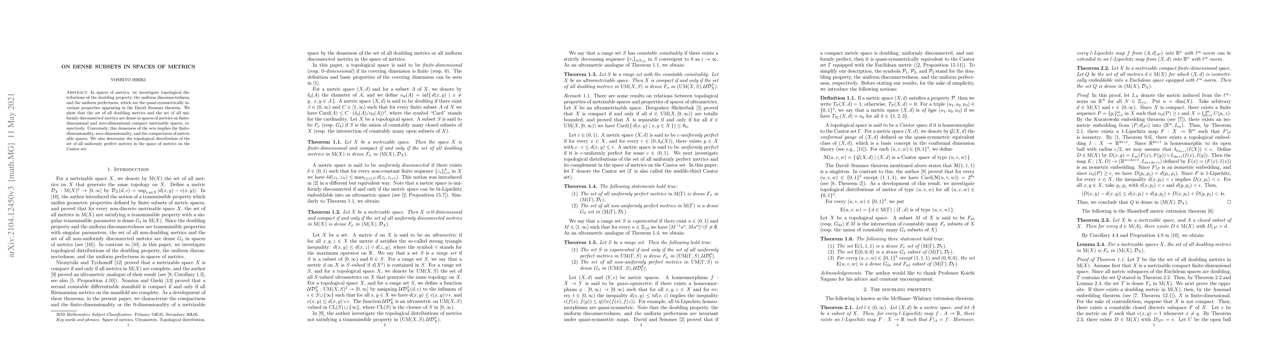 This paper explores the denseness of doubling and uniformly disconnected metrics in spaces of metrics on finite-dimensional and zero-dimensional compact metrizable spaces, respectively. It also investigates the topological distribution of uniformly perfect metrics on the Cantor set, revealing the inherent properties of the underlying spaces.
