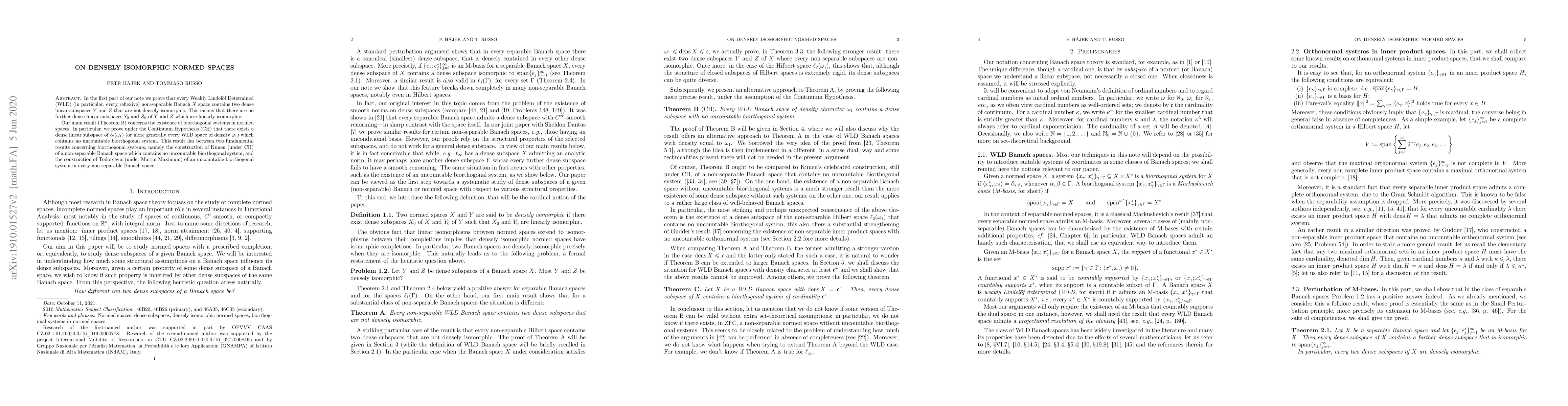 In the first part of our note we prove that every Weakly Lindel\"of Determined (WLD) (in particular, every reflexive) non-separable Banach $X$ space contains two dense linear subspaces $Y$ and $Z$ that are not densely isomorphic. This means that there are no further dense linear subspaces $Y_0$ and $Z_0$ of $Y$ and $Z$ which are linearly isomorphic. Our main result (Theorem B) concerns the existence of biorthogonal systems in normed spaces. In particular, we prove under the Continuum Hypothesis (CH) that there exists a dense linear subspace of $\ell_2(\omega_1)$ (or more generally every WLD space of density $\omega_1$) which contains no uncountable biorthogonal system. This result lies between two fundamental results concerning biorthogonal systems, namely the construction of Kunen (under CH) of a non-separable Banach space which contains no uncountable biorthogonal system, and the construction of Todor\u{c}evi\'c (under Martin Maximum) of an uncountable biorthogonal system in every non-separable Banach space.