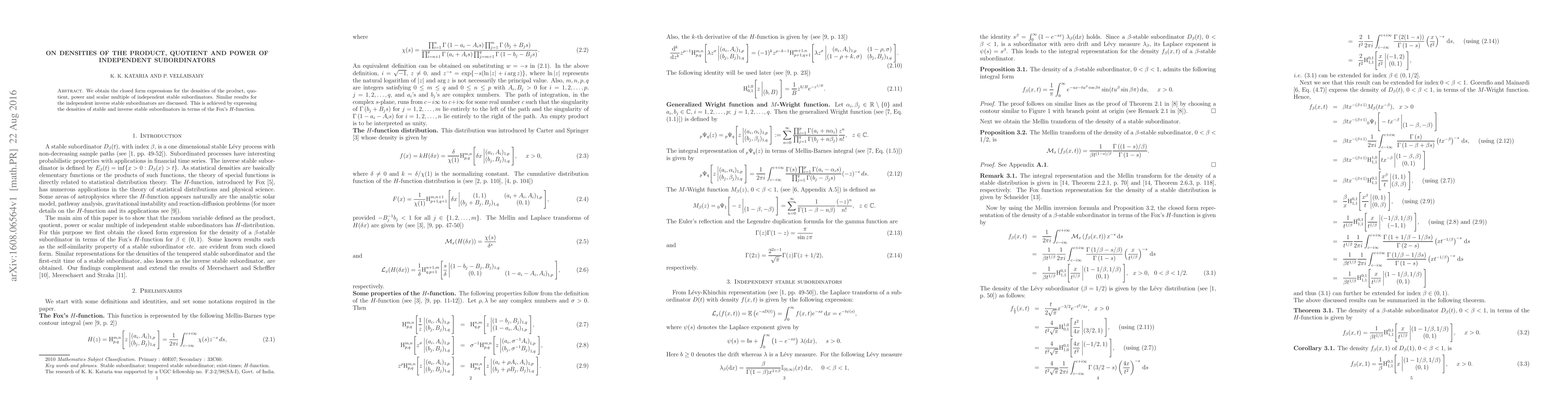 This paper derives closed-form expressions for the densities of product, quotient, power, and scalar multiple of independent stable subordinators using Fox's $H$-function.