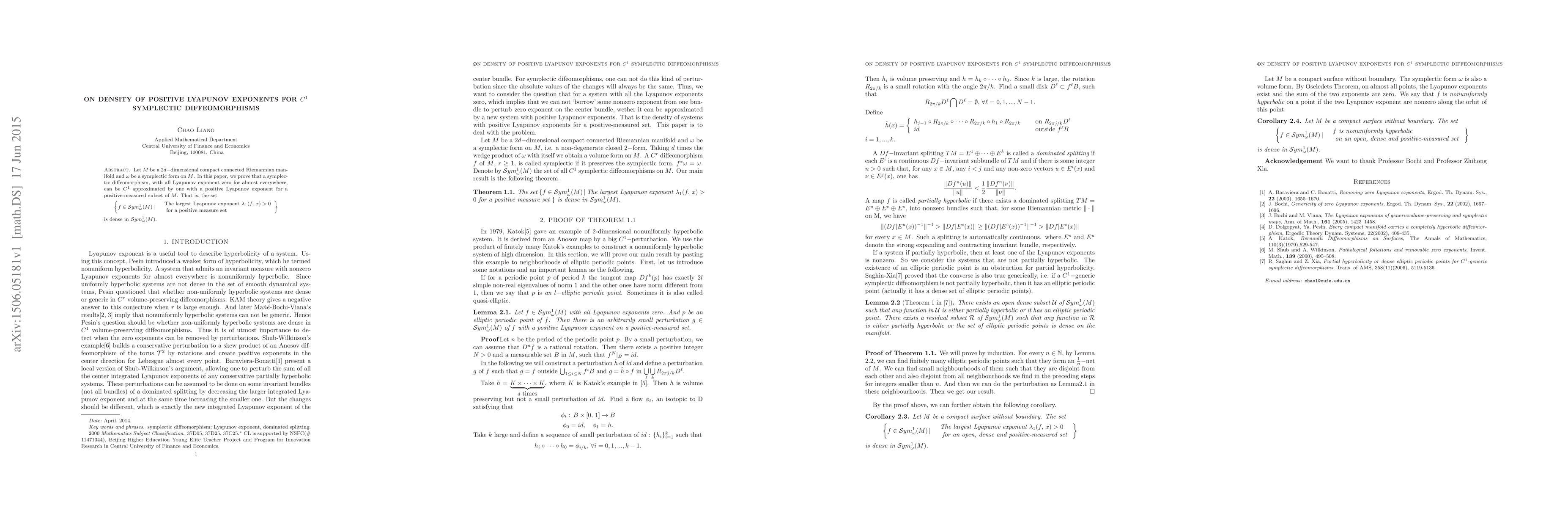A symplectic diffeomorphism with zero Lyapunov exponents can be approximated by one with a positive exponent for almost the entire manifold, proving its density in the space of symplectic diffeomorphisms.