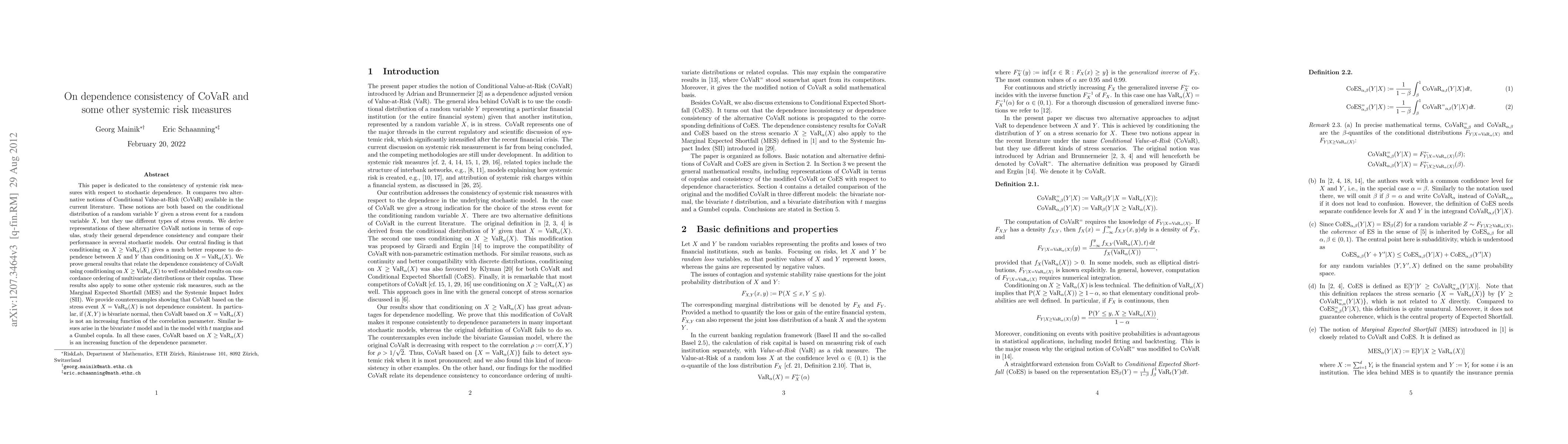 This paper is dedicated to the consistency of systemic risk measures with respect to stochastic dependence. It compares two alternative notions of Conditional Value-at-Risk (CoVaR) available in the current literature. These notions are both based on the conditional distribution of a random variable Y given a stress event for a random variable X, but they use different types of stress events. We derive representations of these alternative CoVaR notions in terms of copulas, study their general dependence consistency and compare their performance in several stochastic models. Our central finding is that conditioning on X>=VaR_\alpha(X) gives a much better response to dependence between X and Y than conditioning on X=VaR_\alpha(X). We prove general results that relate the dependence consistency of CoVaR using conditioning on X>=VaR_\alpha(X) to well established results on concordance ordering of multivariate distributions or their copulas. These results also apply to some other systemic risk measures, such as the Marginal Expected Shortfall (MES) and the Systemic Impact Index (SII). We provide counterexamples showing that CoVaR based on the stress event X=VaR_\alpha(X) is not dependence consistent. In particular, if (X,Y) is bivariate normal, then CoVaR based on X=VaR_\alpha(X) is not an increasing function of the correlation parameter. Similar issues arise in the bivariate t model and in the model with t margins and a Gumbel copula. In all these cases, CoVaR based on X>=VaR_\alpha(X) is an increasing function of the dependence parameter.