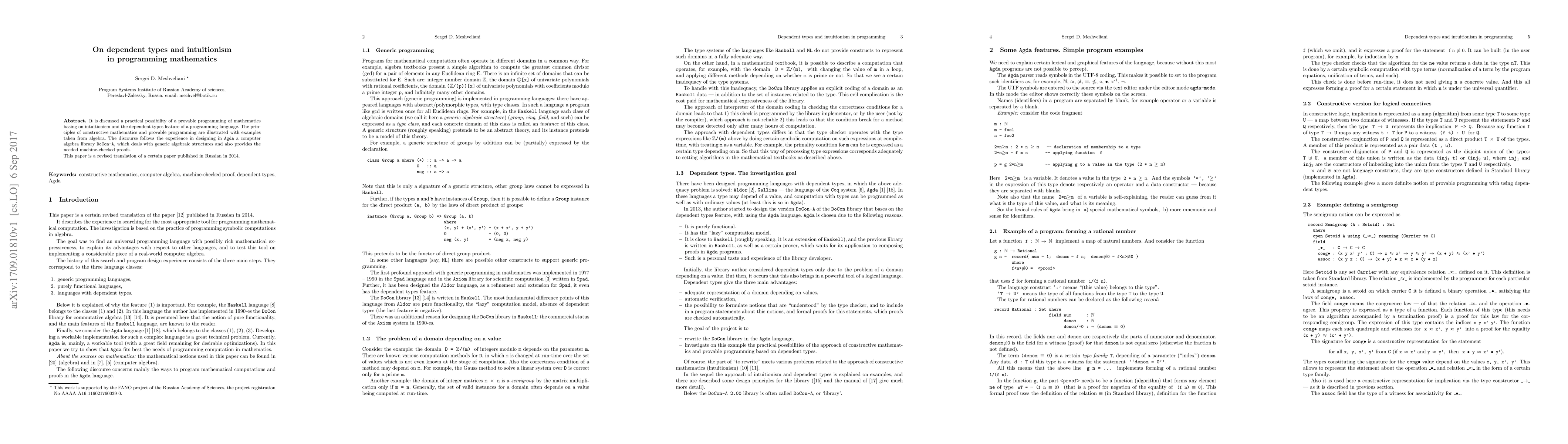 This paper explores the integration of intuitionism and dependent types in programming to enable provable programming of mathematics, illustrated through examples in algebra and the experience of designing a computer algebra library in Agda. The work is a revised translation of a 2014 Russian publication.